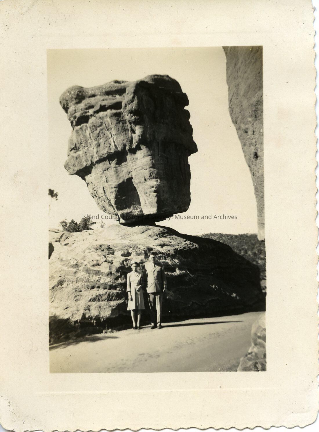 Photograph of a man in army uniform - probably a doctor, and man in suit and glasses, on path below a balancing rock. Photo stamp on the back: Oct 5 1942.