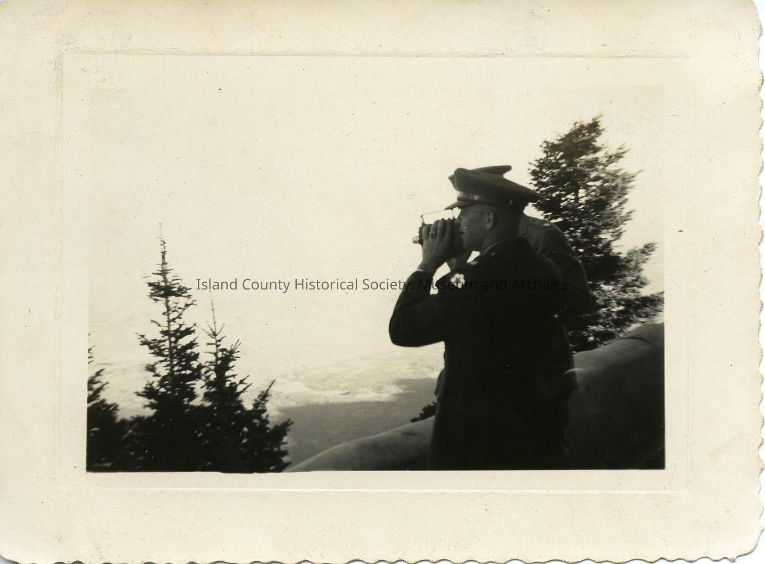 Photograph of two men standing on a hill - one of them is holding binoculars. Photo stamp on the back: Oct 5 1942. Man is Lt. Col. Howard Butters Kellogg