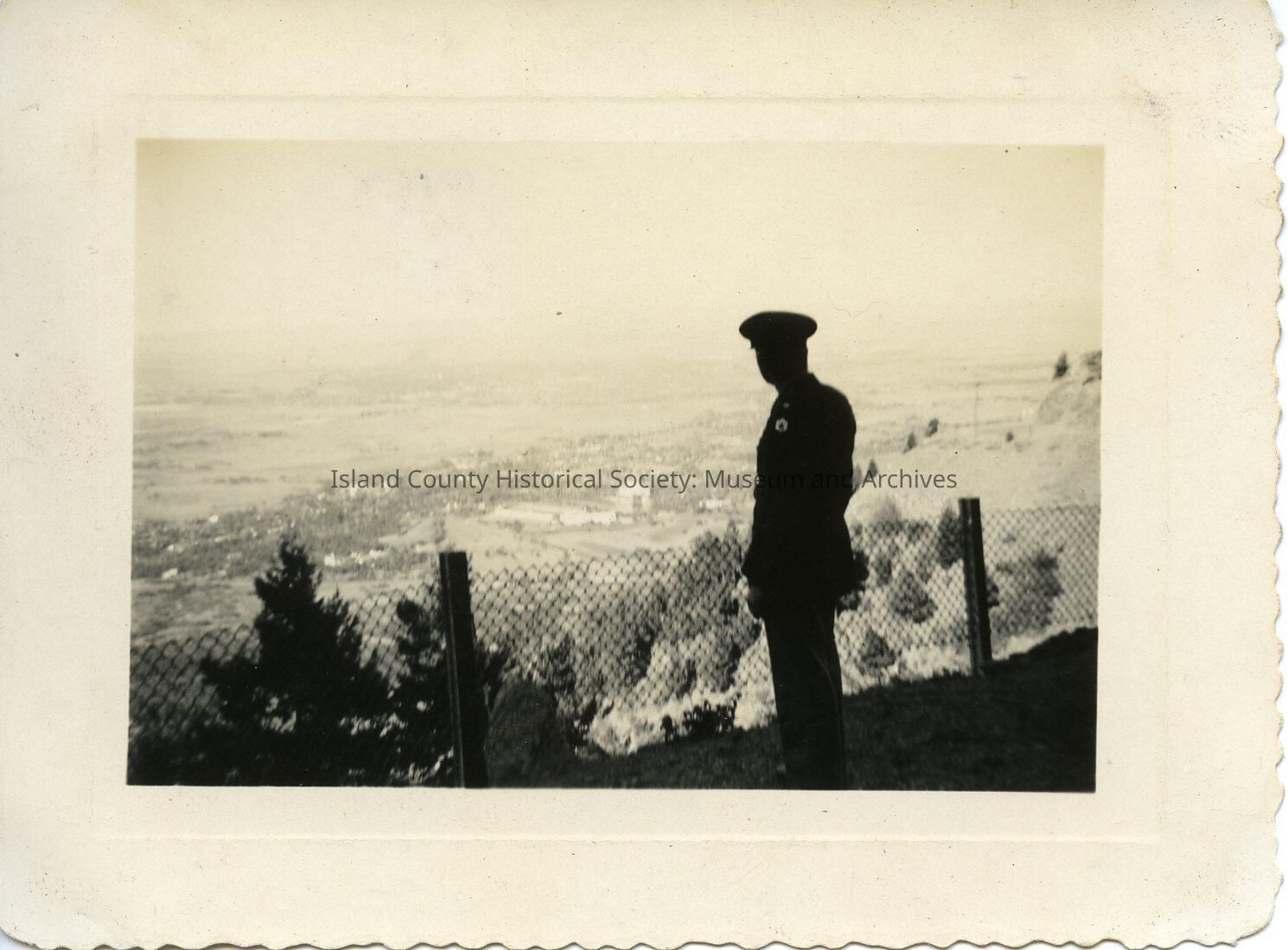 Photograph of a man in uniform looking at a city. Photo stamp on the back: Oct 5 1942. Man is Lt. Col. Howard Butters Kellogg