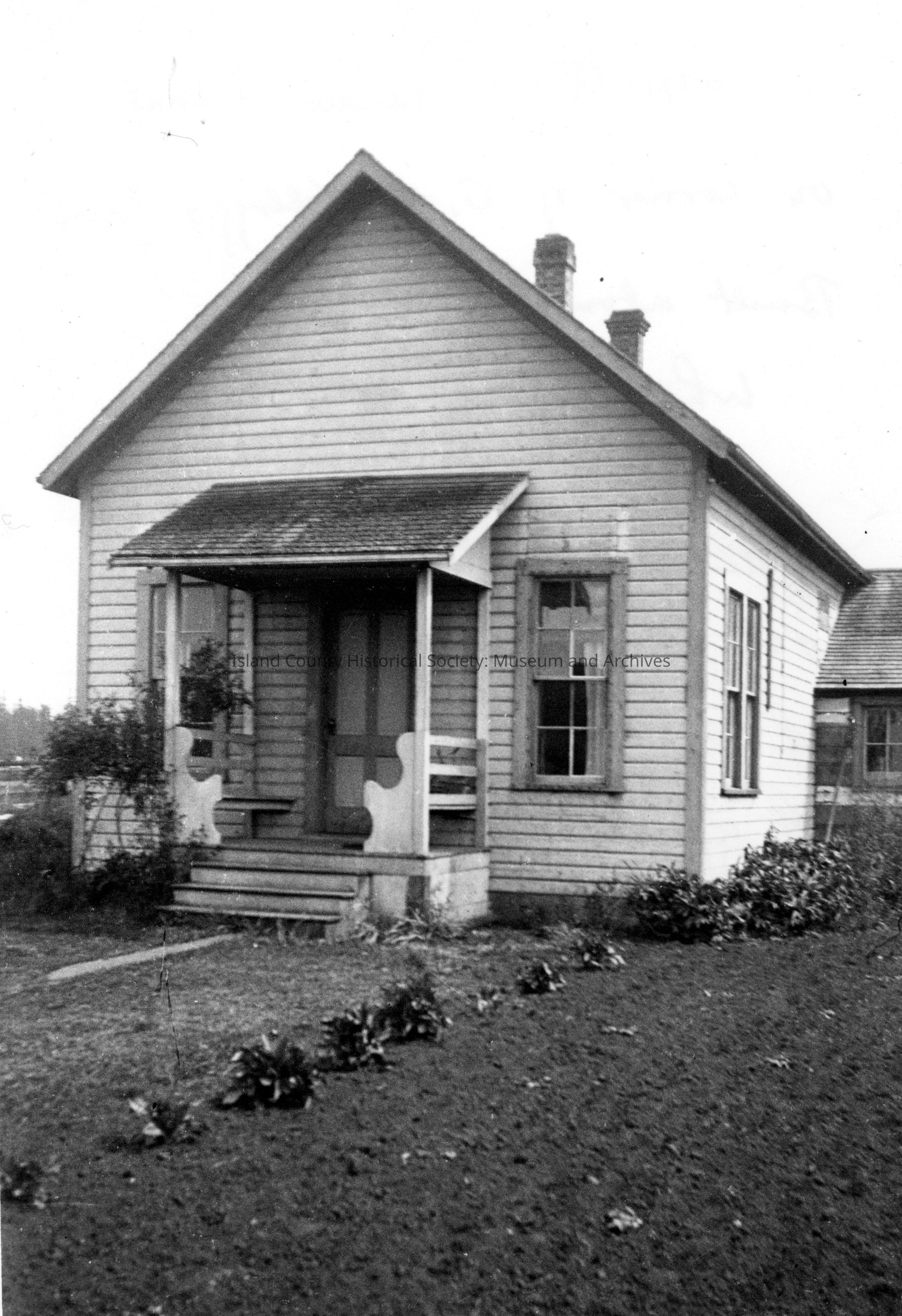 First one room school on Whidbey, built by the County on one acre of land from the Albert H. Kellogg farm on Smith's Prairie. Some time in the early 1890's it was turned into a private residence, John Beach home, as pictured. The U.S. Navy took over the whole Kellogg farm for an emergency landing air strip during WWII.