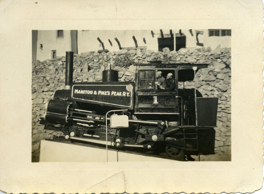 Photograph of two people riding the Manitou & Pike's Peak R. Y. train. Photo stamp on the back: Oct 5 1942.
