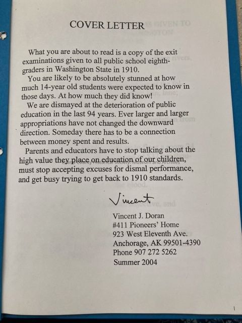 One photocopy of 1910 Washington state eighth grade exit examination. Examination is presented in new blue report cover including a cover letter from Vincent Doran, and personal account of grade school life in 1923 by Vincent Doran. There are twenty three pages total.Collection