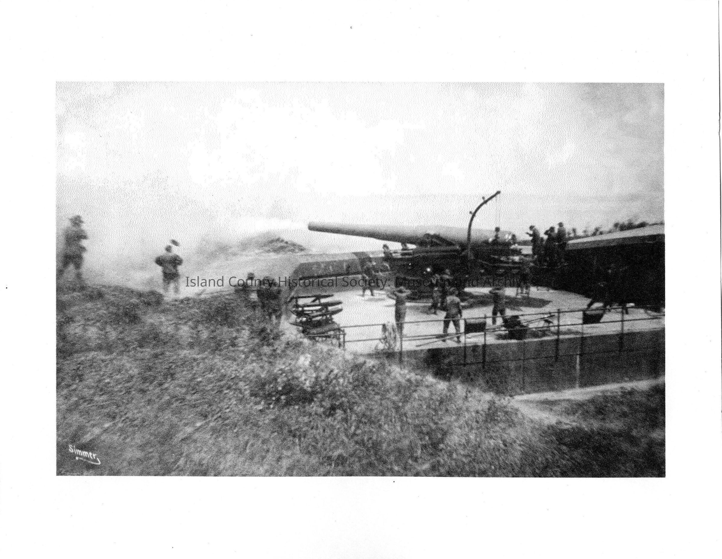 Black and white image of test firing at Fort Casey. A man's hat may or may not be flying off due to the blast on the left.