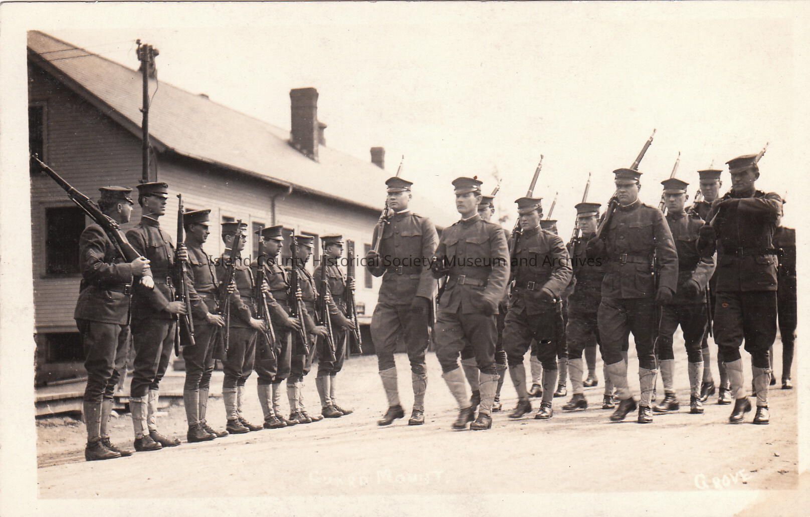 Fort Casey Guard Mount. Off going guard marching. On coming guard at attention in front of the Guard House. The background building is the Qurtermaster building. Multiple era uniforms. The officer of the guard on right rear (look fo the leather leggings). 1916 SJK