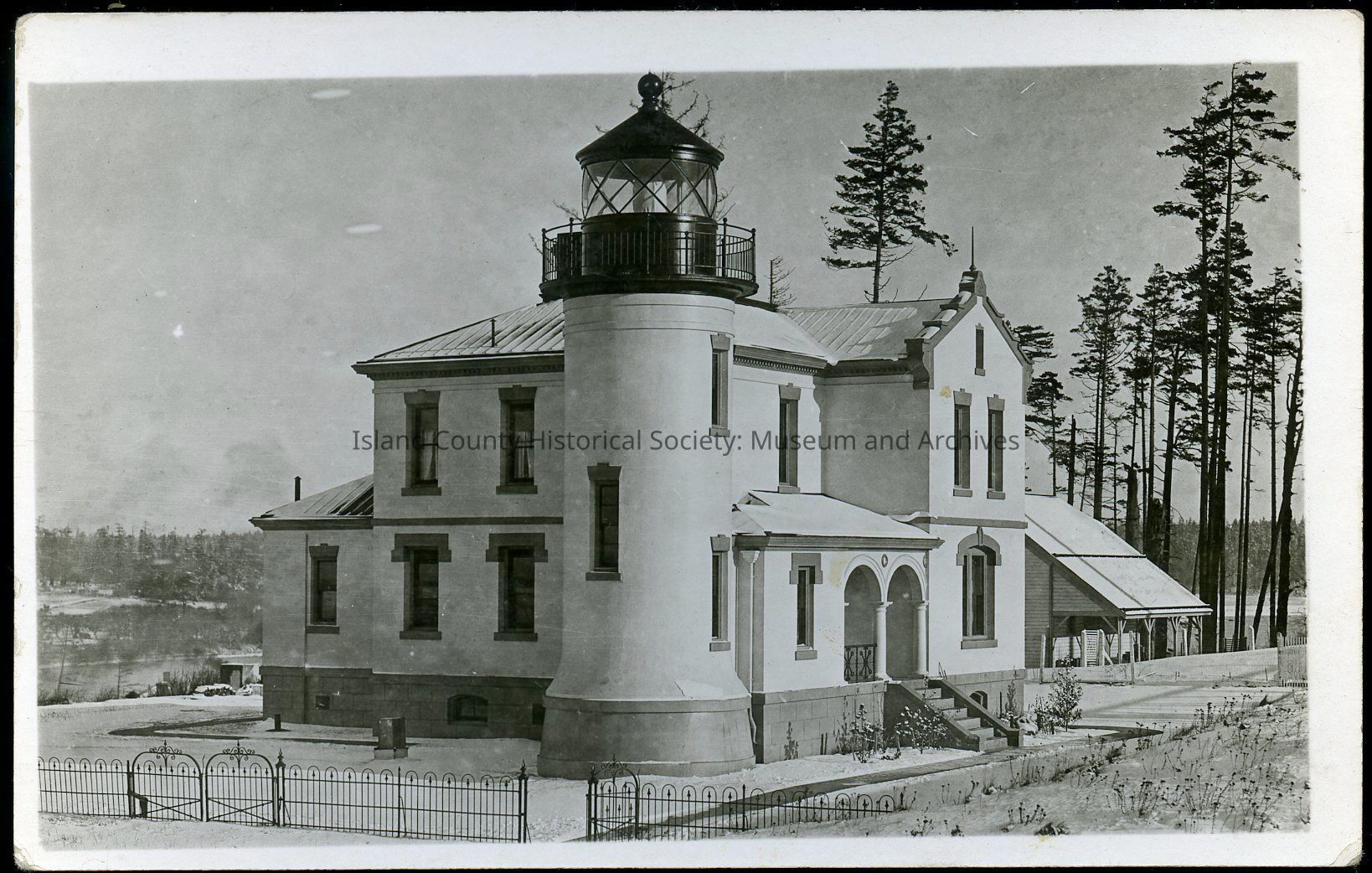 Postcard showing Admiralty Head Lighthouse in Fort Casey, 1918. The angled roof in the background of the photo is part of the horse stables that were once associated with the lighthouse.Collection