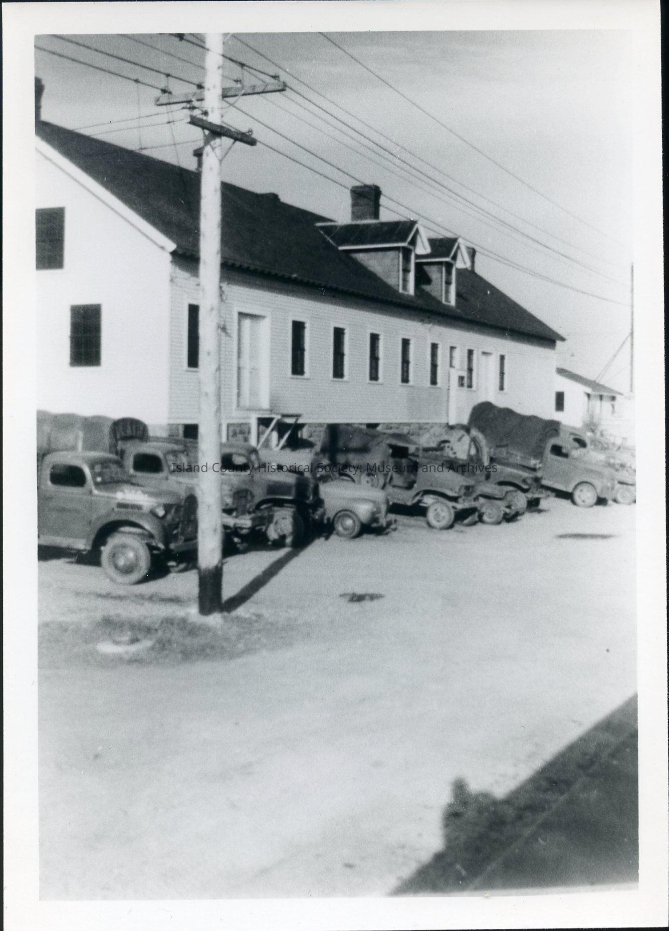 Photograph of Fort Casey's motor pool during World War II. The vehicles are parked behind the Quartermaster's Storehouse.Photograph Details