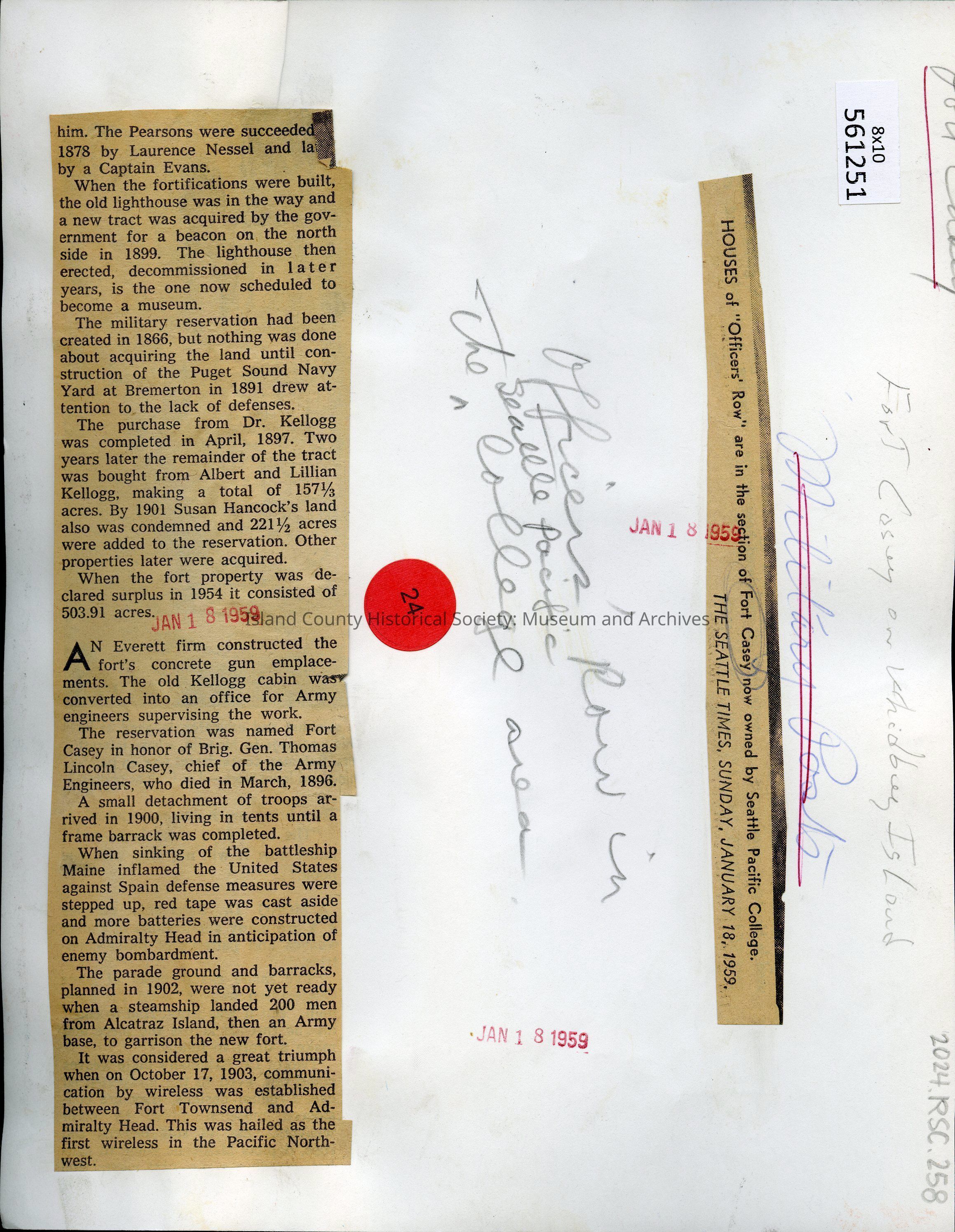 Photograph of Fort Casey's "Officers' Row". This section of Fort Casey was owned by Seattle Pacific College, as reported by The Seattle Times (1959)Photograph Details