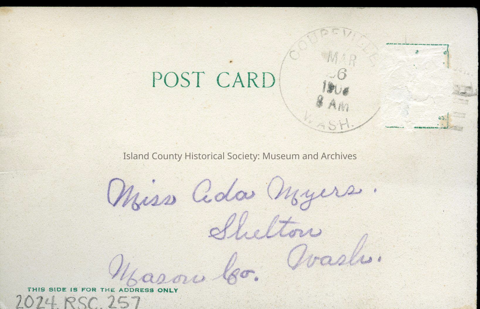 Postcard depicting Fort Casey. Reverse addressed to Miss Ada Myers of Shelton, Washington, Masonic Lodge.Collection