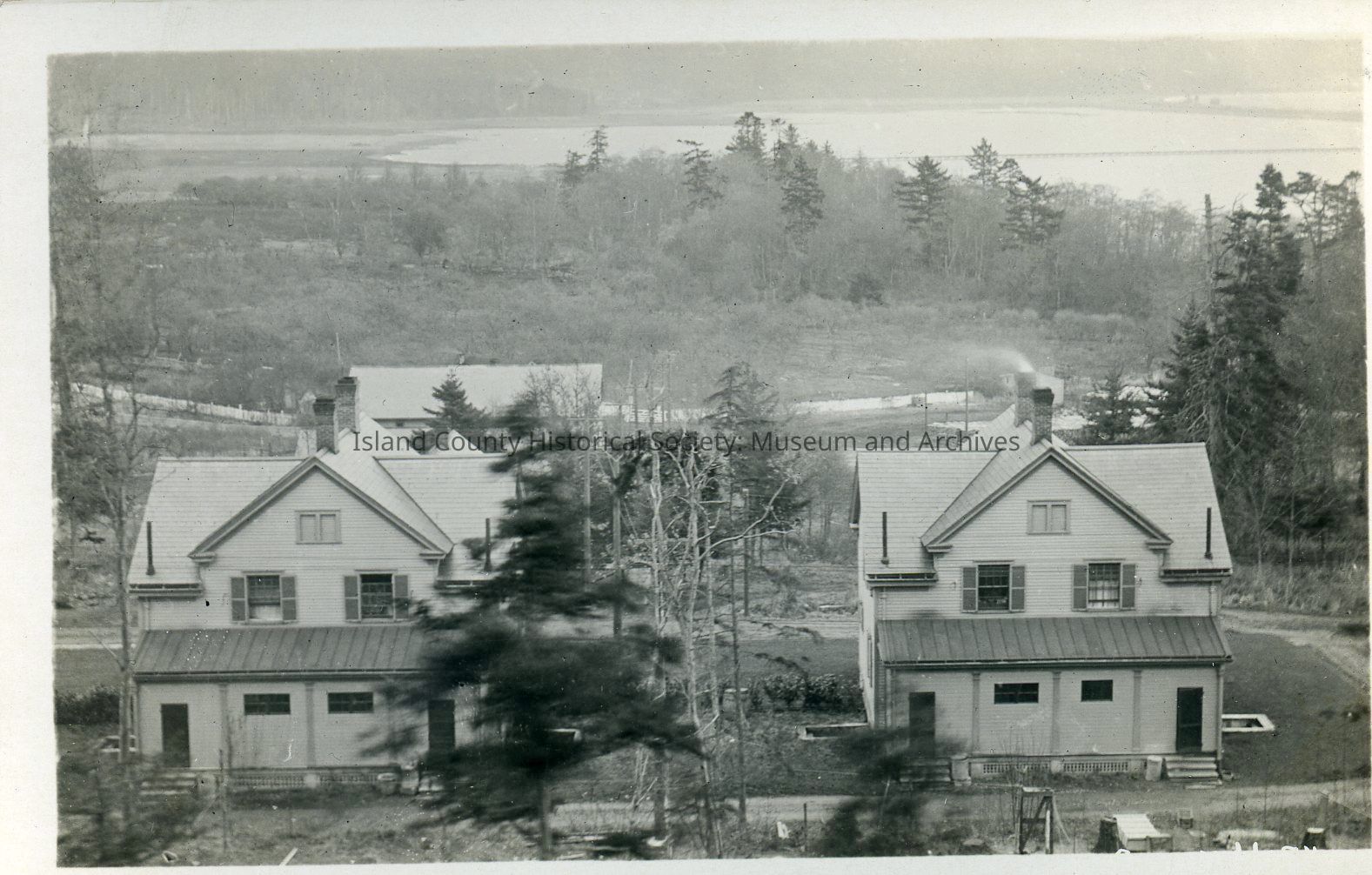 Postcard of Sergeants' Quarters at Fort Casey, early 1900s. The duplexes overlook Crockett Lake. The field below the duplexes had anti-aircraft guns in World War II.Collection