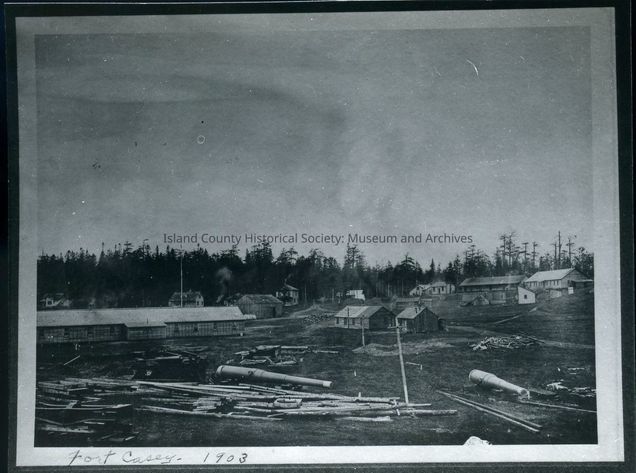 Photograph of Fort Casey under construction. 10-inch gun tubes are visible in the foreground of the photo, behind and next to timber piles. C. 1900-1903.Photograph Details