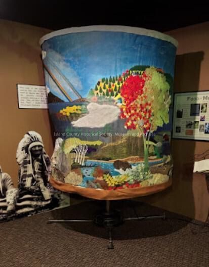 A large beaded piece of canvas attached to a motorized pedestal so that it can rotate. The piece is titled "Four Seasons of Water" and was created by artist Russell Morton, a non-indigenous beadworker. Russell obtained funding for this art piece through various local tribes. In September 2021. Russell Morton added magnetized beadwork to the piece.Collection