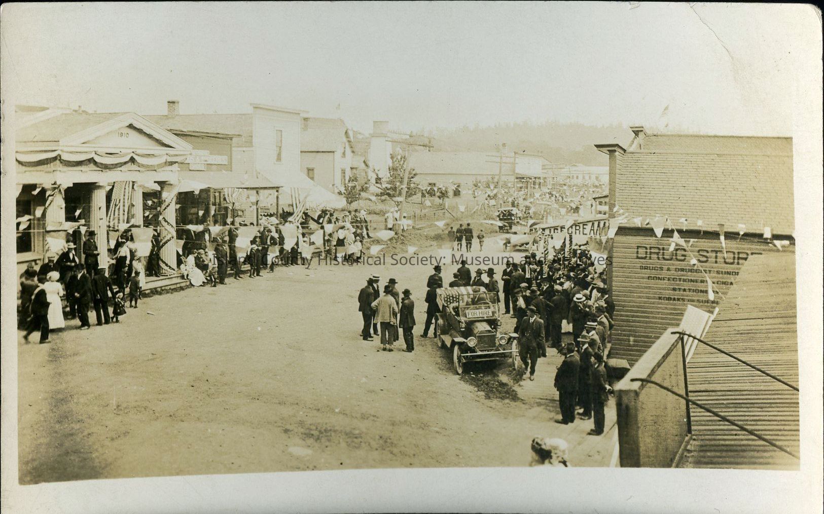 Postcard depicting the Fourth of July festivities on Barrington Avenue, Oak Harbor, c. 1913.