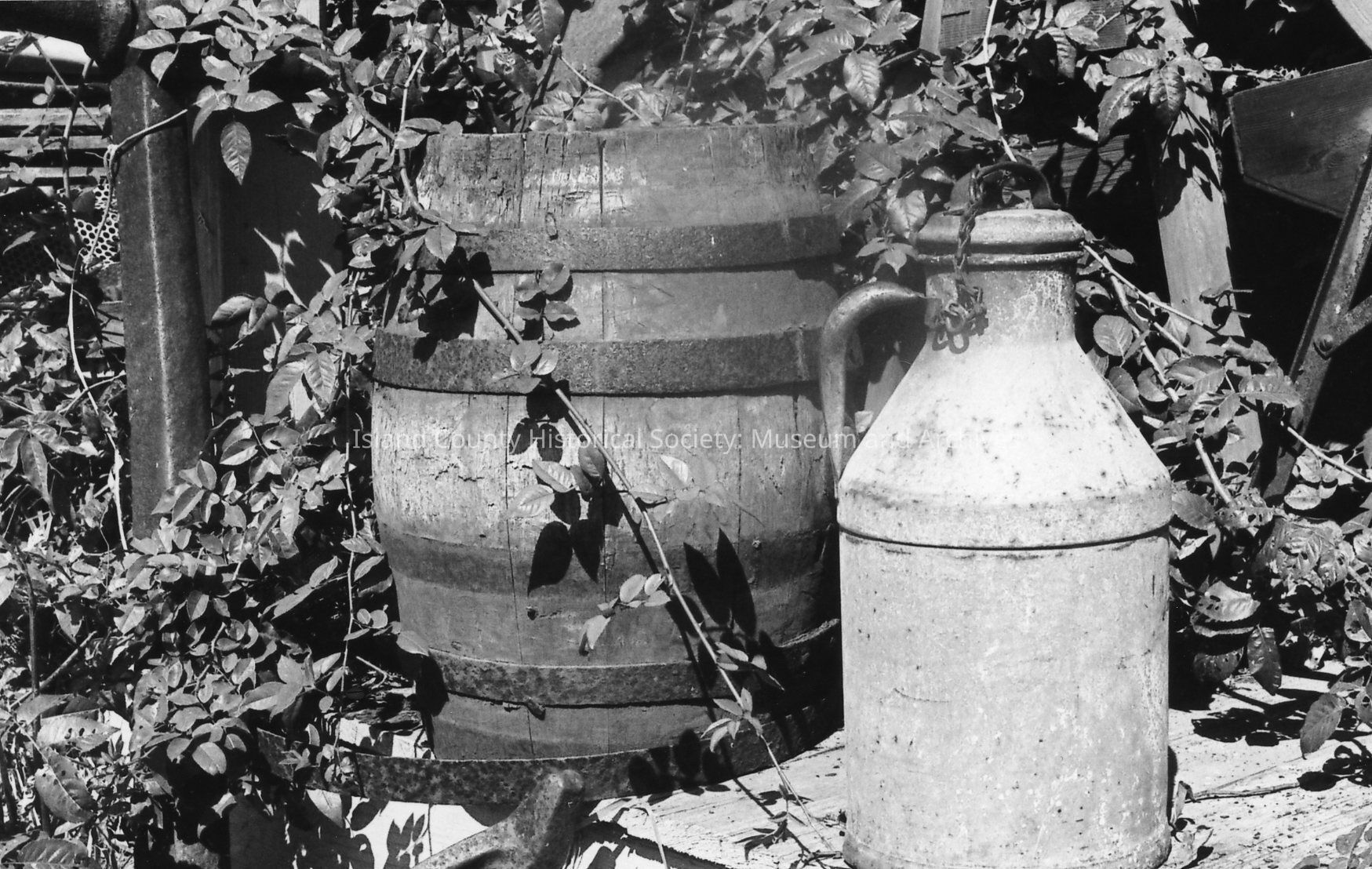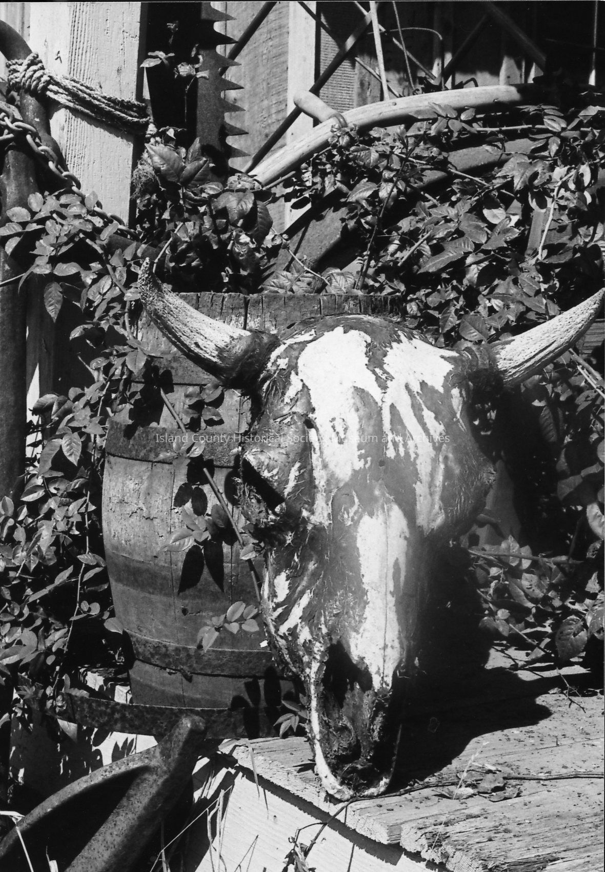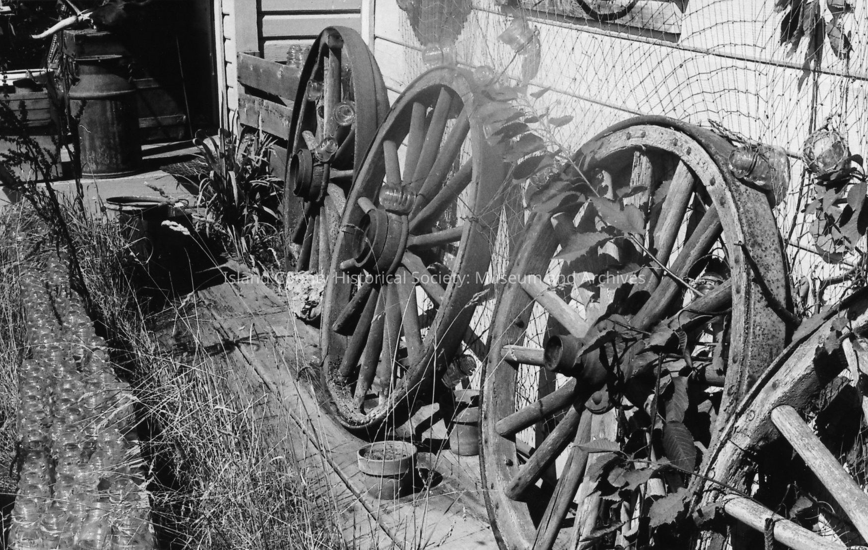 Wooden frame building with "Frontier Store" on sign on false front. Wagon wheels, crocks, ox yoke, trunk, sharpening stone and other items crowd the porch. A board and batten garage stands to left.Photograph Details