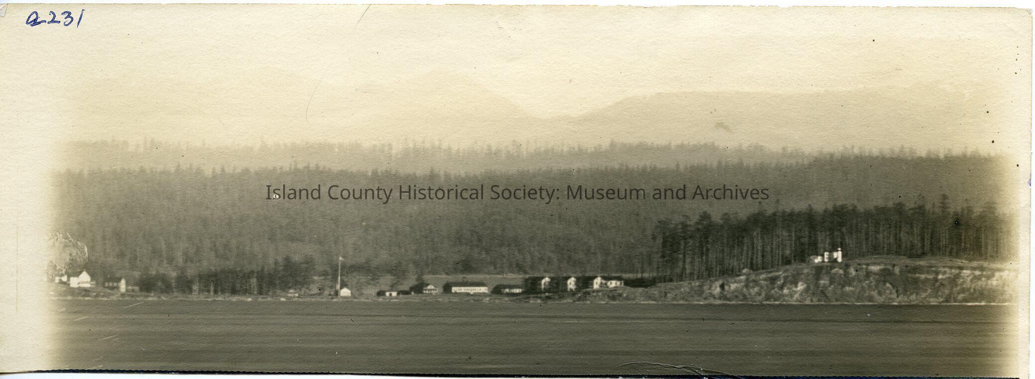 Early panarama of Ft. Casey circa 1905. No searchlights on the clifff. Full water tower with tank behind fire control hill. Rec building intact. Very rare image since fort photo were restricted until 1910. This is one half of the photo.