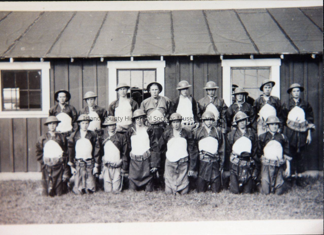 Photograph of soldiers participating in gas mask drills at Fort Casey, c. 1940-1945.Photograph Details