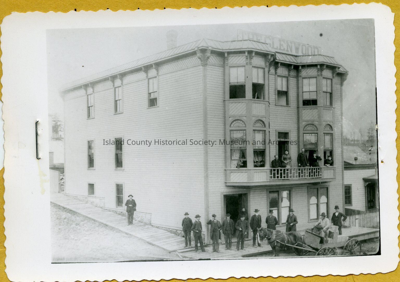 Glenwood Hotel in Coupeville. There is a large group of men in front of the Hotel and men and women on the front balcony. A horse-drawn wagon is in front. Photo glued to brown paper on the bottom and photo 2016.130.010 is attached above it.
