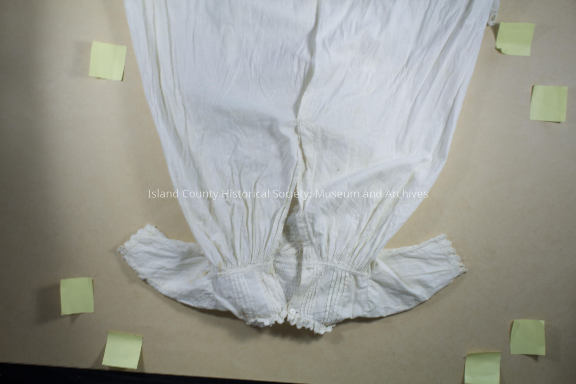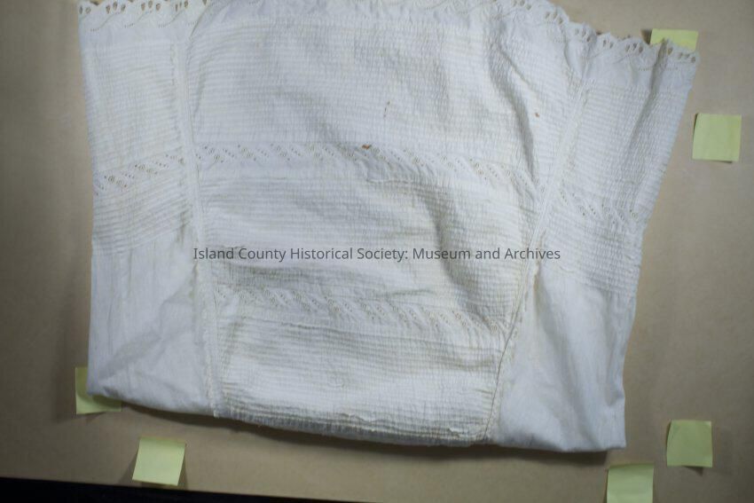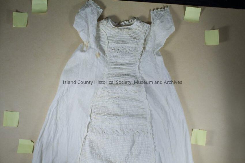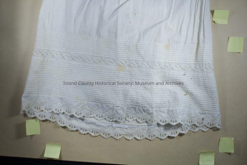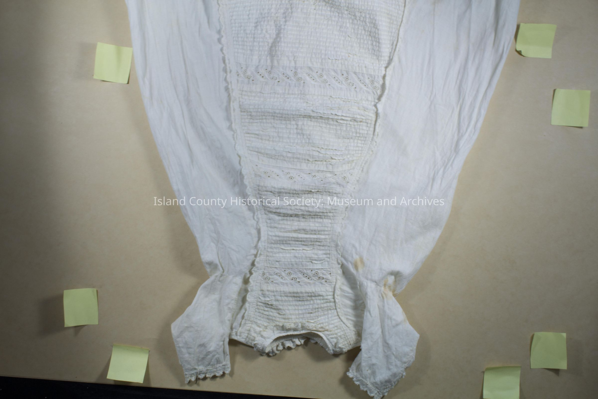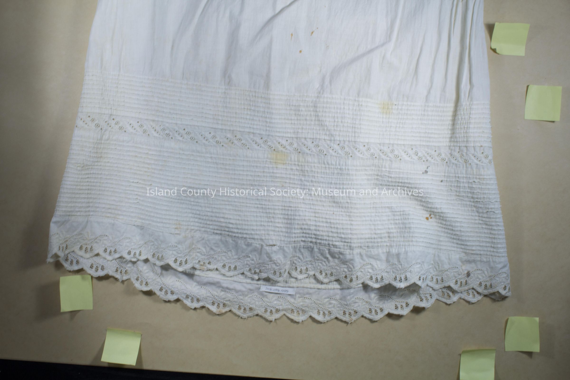 Cotton christening gown. Slit at the back with two round plastic buttons. Frilled collar. On the front is design of bands of ruching and bands decorated with berries and leaves (sewn design). No lining. Plain back. Some fraying on the edges. Short sleeves and long skirt.
