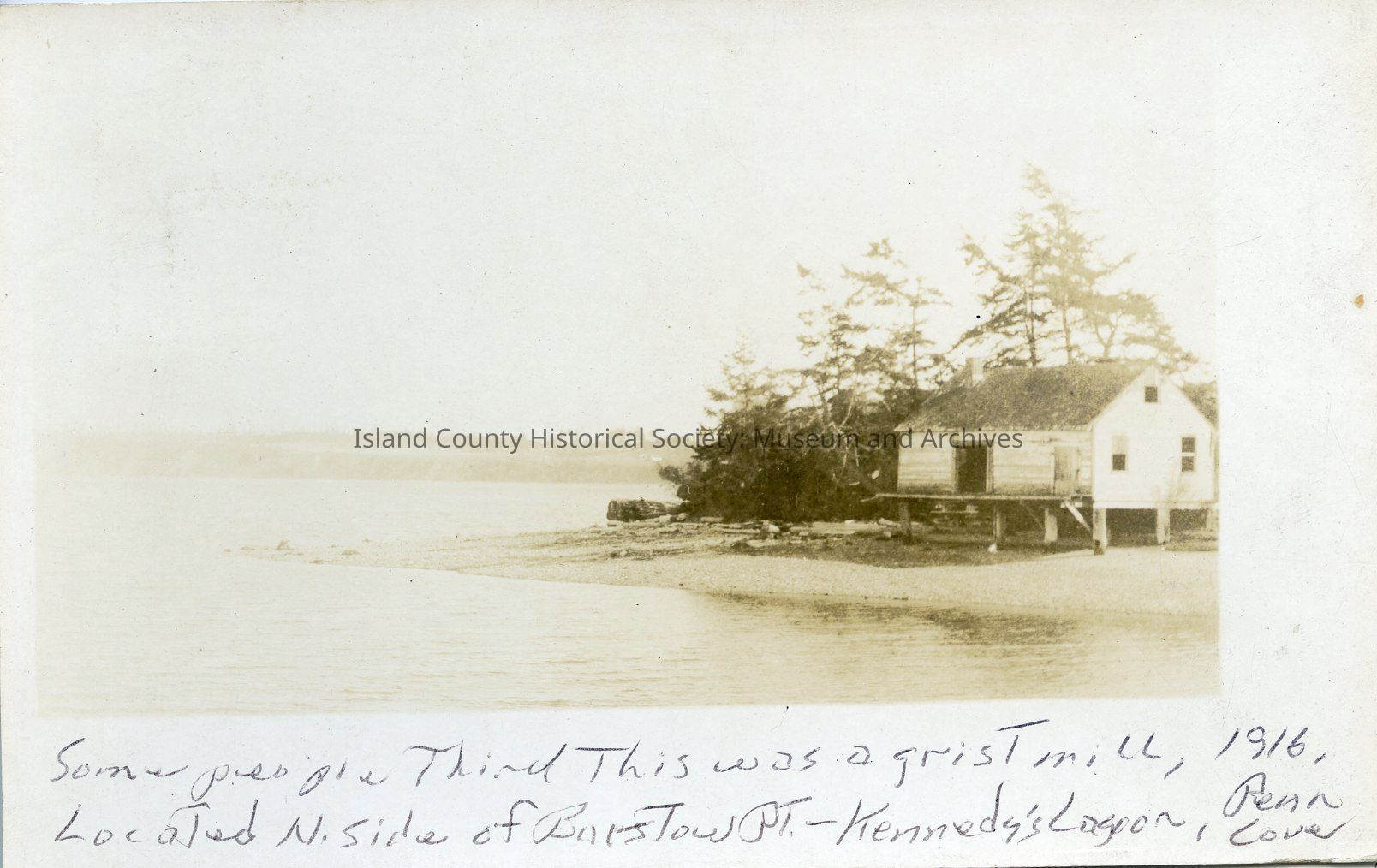 Postcard depicting a small building on stilts, located near the shore. Handwritten note from Roger Sherman below the picture reads, "Some people think this was a grist mill, 1916. Located N. side of Barstow Point -- Kennedy's Lagoon, Penn Cove."