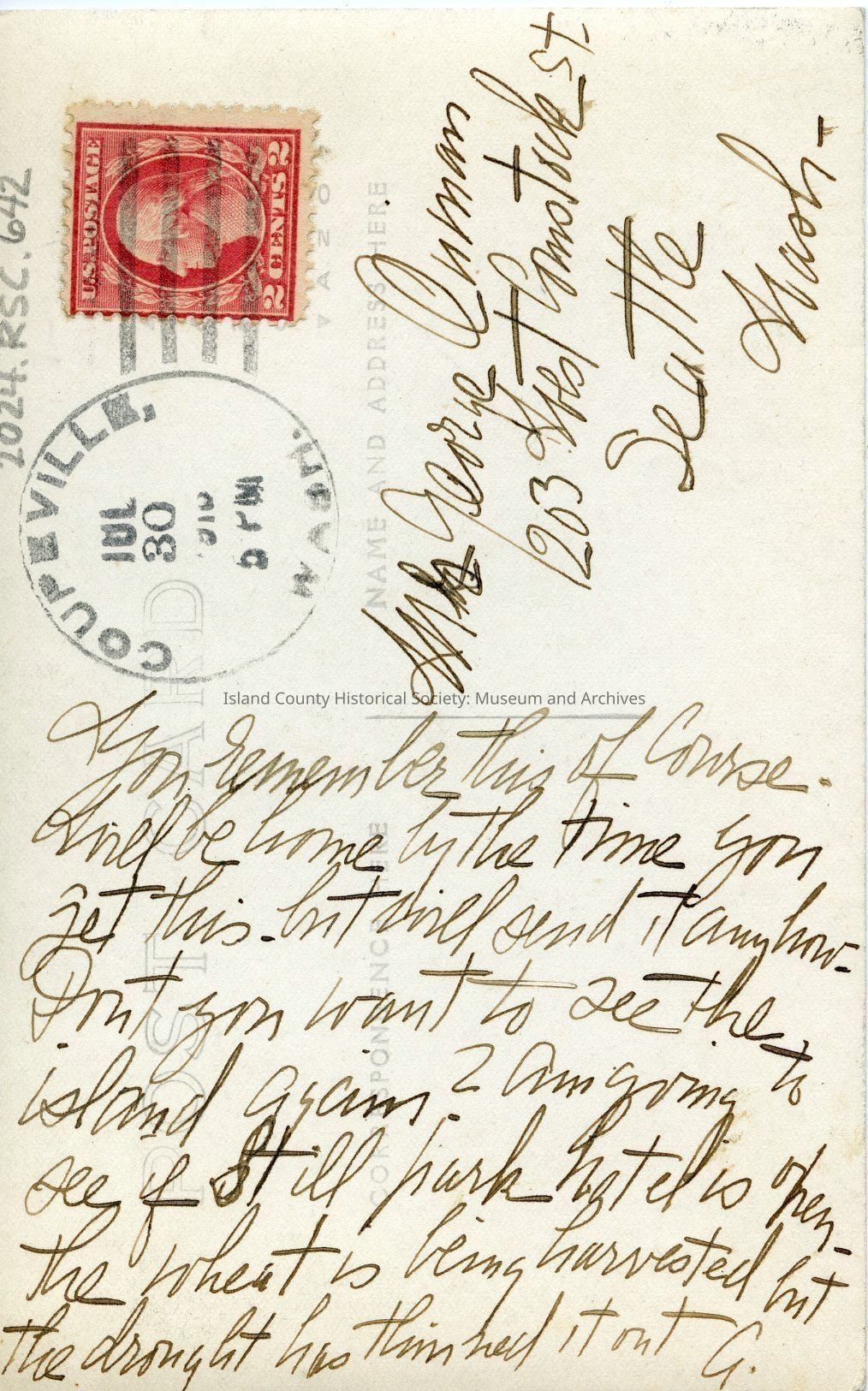 Postcard addressed to Mrs. George Quinan[?], 203 West Comstock Street, Seattle, Wash. Postmarked 30 July 1916 or 1918, Coupeville.