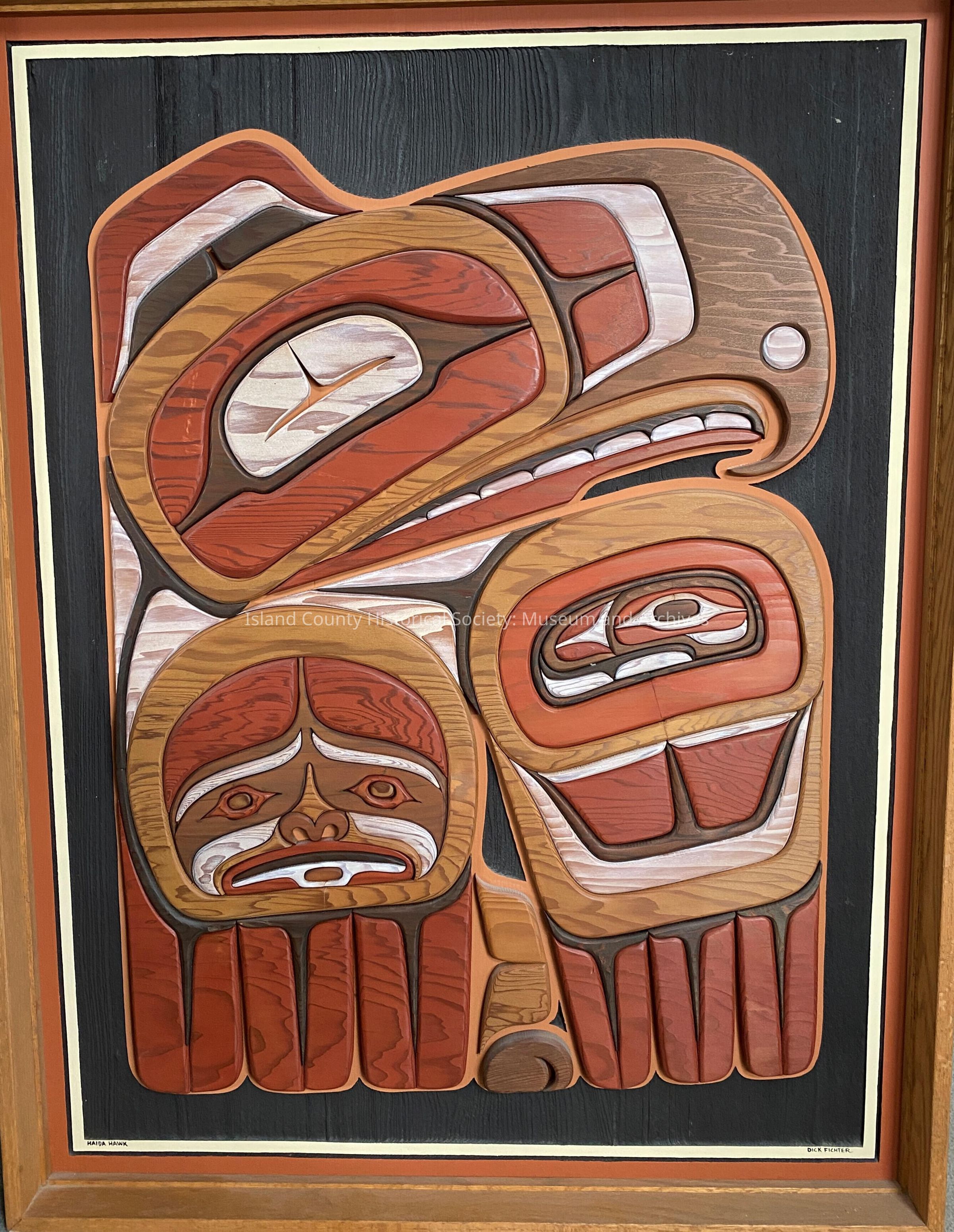A formline carving of a hawk, with a women's face on one of it's wings and ovoids on the other. The carving has a black toned background with red, brown, and pale colored wood making up the design. The carving is a rendition of Freda Diesing's Haida Hawk, carved by Dick FitcherCollection