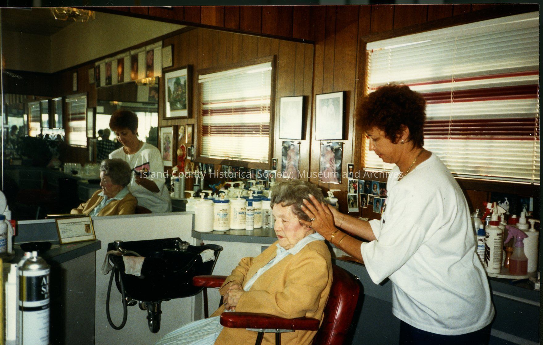 A woman sits in a chair while a stylist fixes her hair. In the background are a mirror and window, sink, beauty license, and numerous bottles and cans of hair preparations.Photograph Details