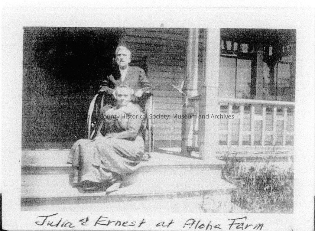 Julia and Ernest at Aloha Farm, Julia is sitting on the steps and Ernest is on the porch in his wheelchair.Made/Created