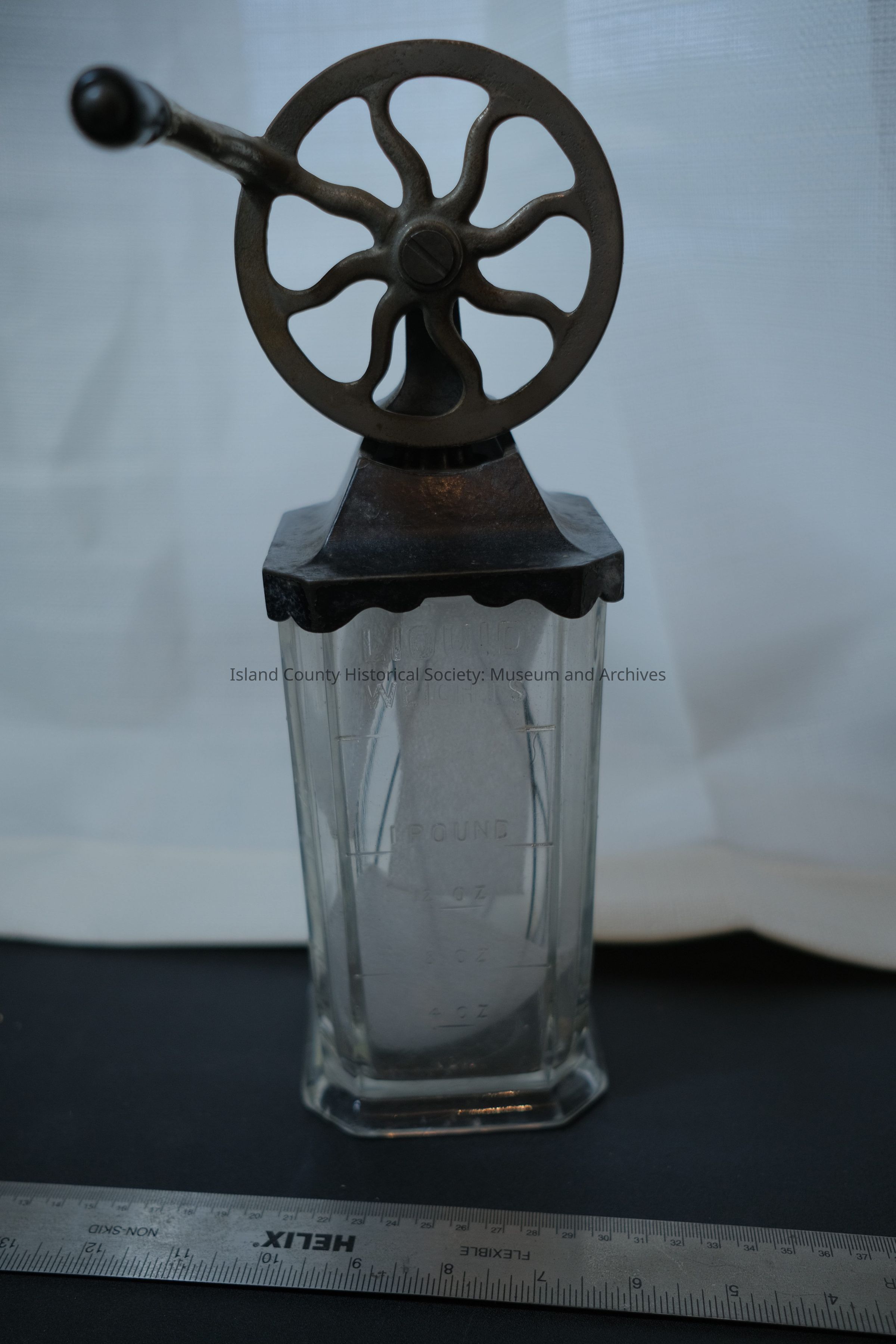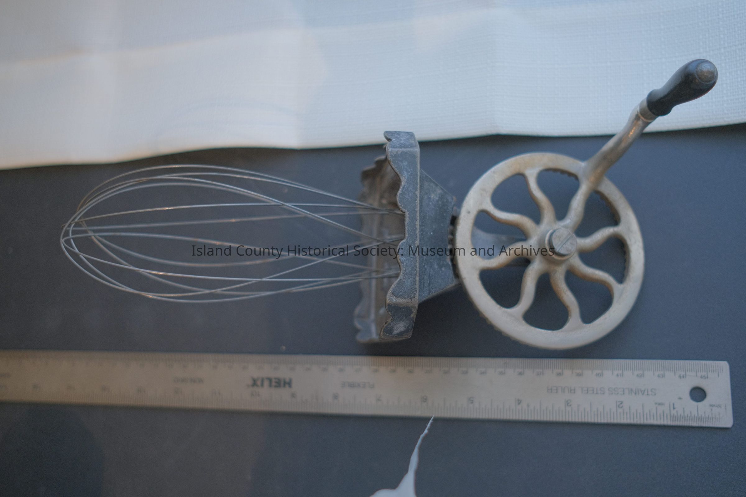 tall glass hand mixer for wet or dry ingredients w/ measurement markings along side, metal hand crank and whisk
