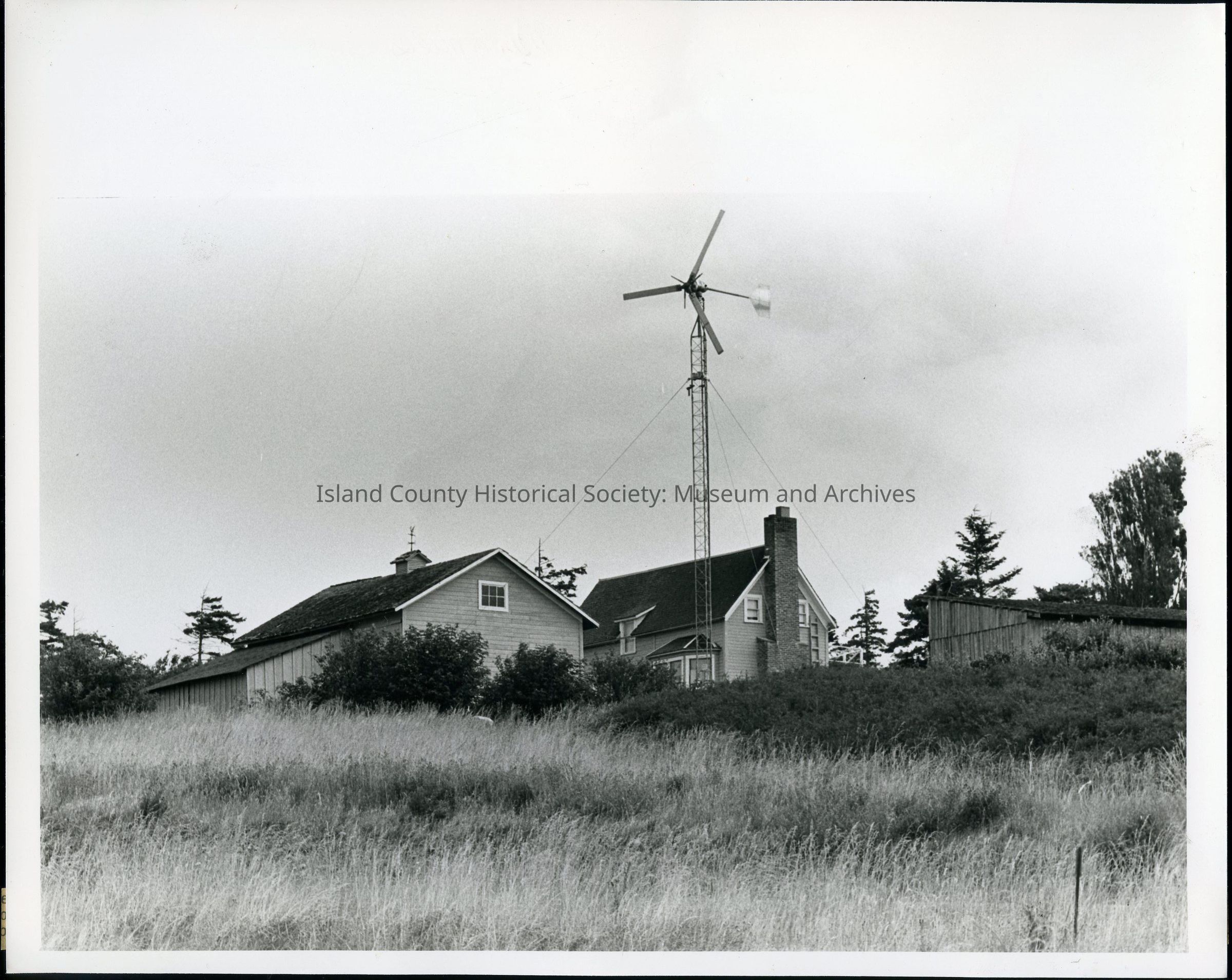Photograph of a house owned by Richard and Faith Hansen. While the house still stands (as of 2013), the windmill is gone. The house is located in the Sierra subdivision on Whidbey Island, near Libbey and West Beach roads. The Hansens owned the Coupeville Wharf from 1949 to 1969.Photograph Details