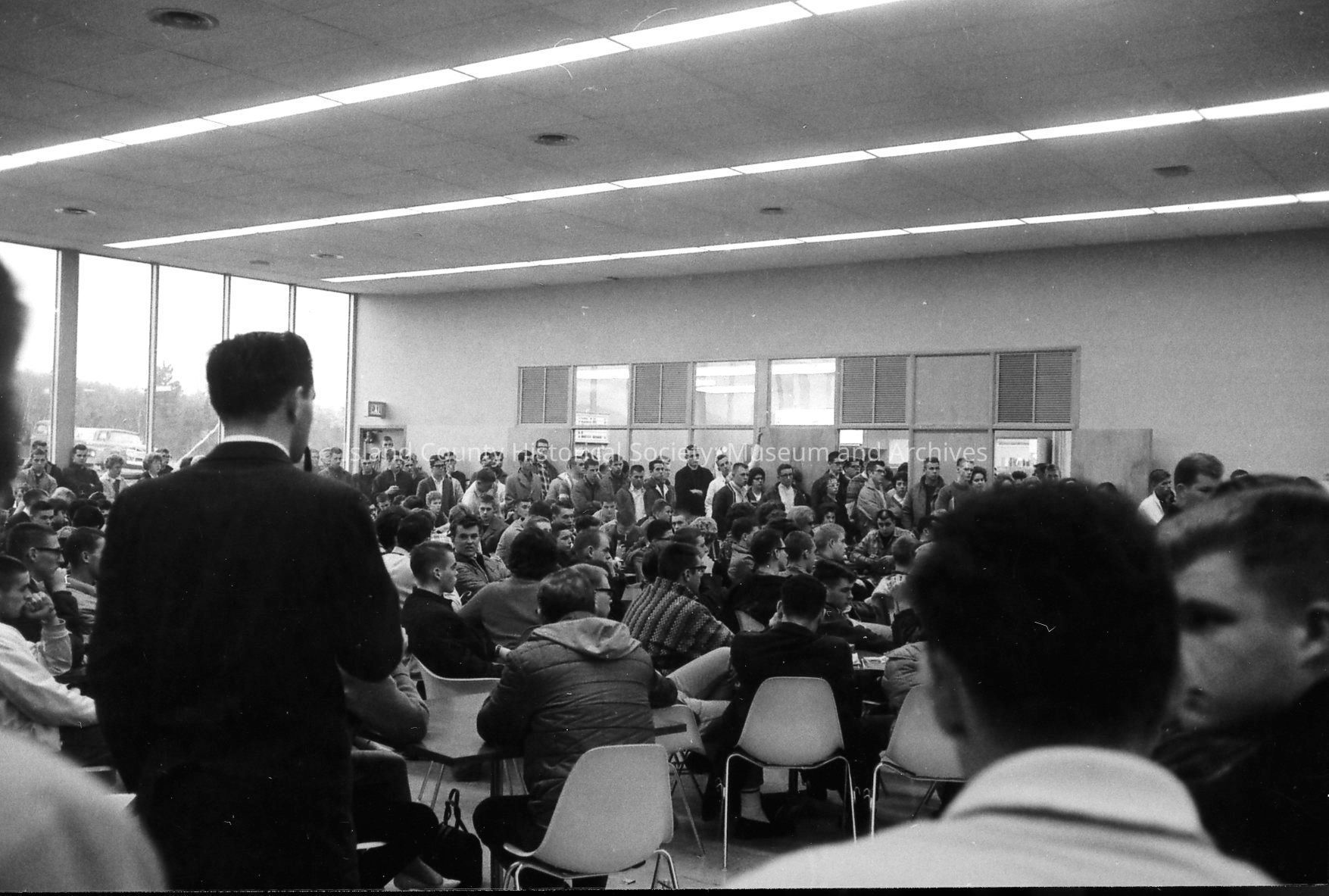 High School boys and a few girls fill a large room and direct their attention at an unknown area. A man in suithas his back to camera.Photograph Details
