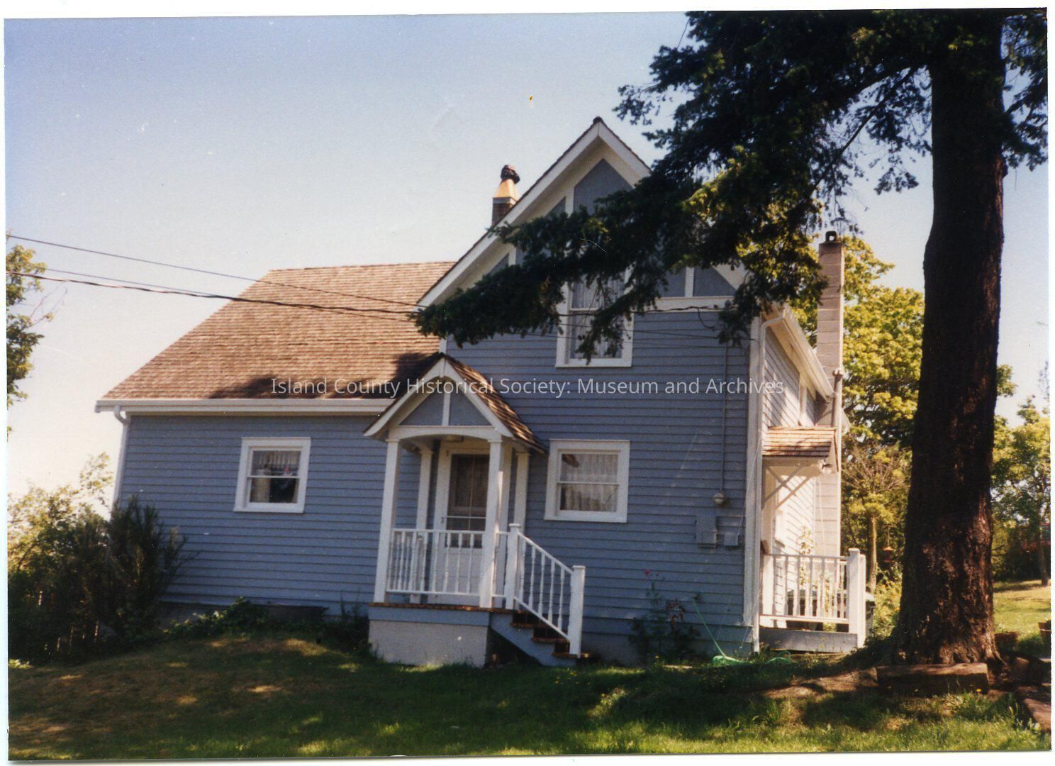 Photo of the building at 805 NW Alexander Street. It is a two-story, blue building, built in 1895, and known as the Holbrook House. It was built by Horace Holbrook. At leat two chimneys, front and side doors with poritics/small porches, front side is two-story.Made/Created