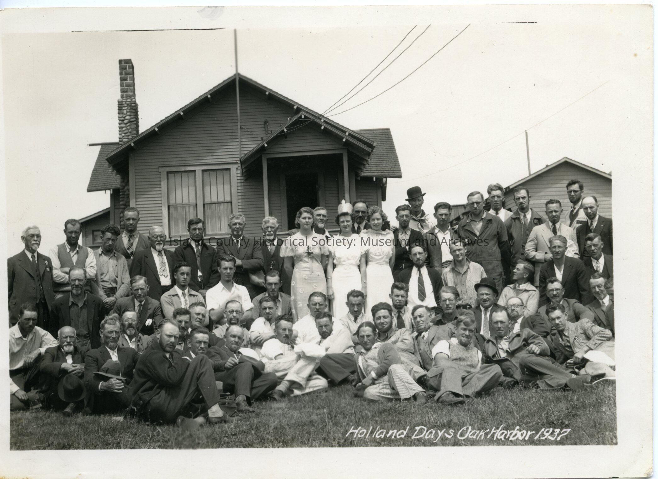 Black and white photo of Holland Days, Oak Harbor City Council, 1937. Large group of men and women lying, sitting, kneeling, standing in a group in front of a house. The only women are the three in the center of the photo, one is wearing a paer crown. All three are wearing light, short-sleeved formal long dresses. The men are in suits, overalls, trousers, sweaters, jackets and hats. The house behind has a small front porch, a double front widow and a tall brick chimney. Telephone or power wires are running to the porch roof. Stamped on the back: Whidbey Island Studio Oak Harbor, Wash.Made/Created