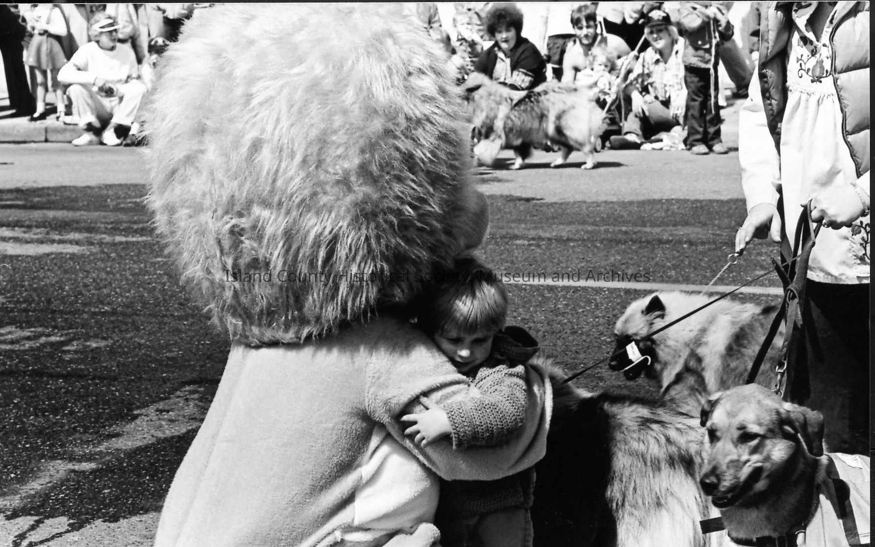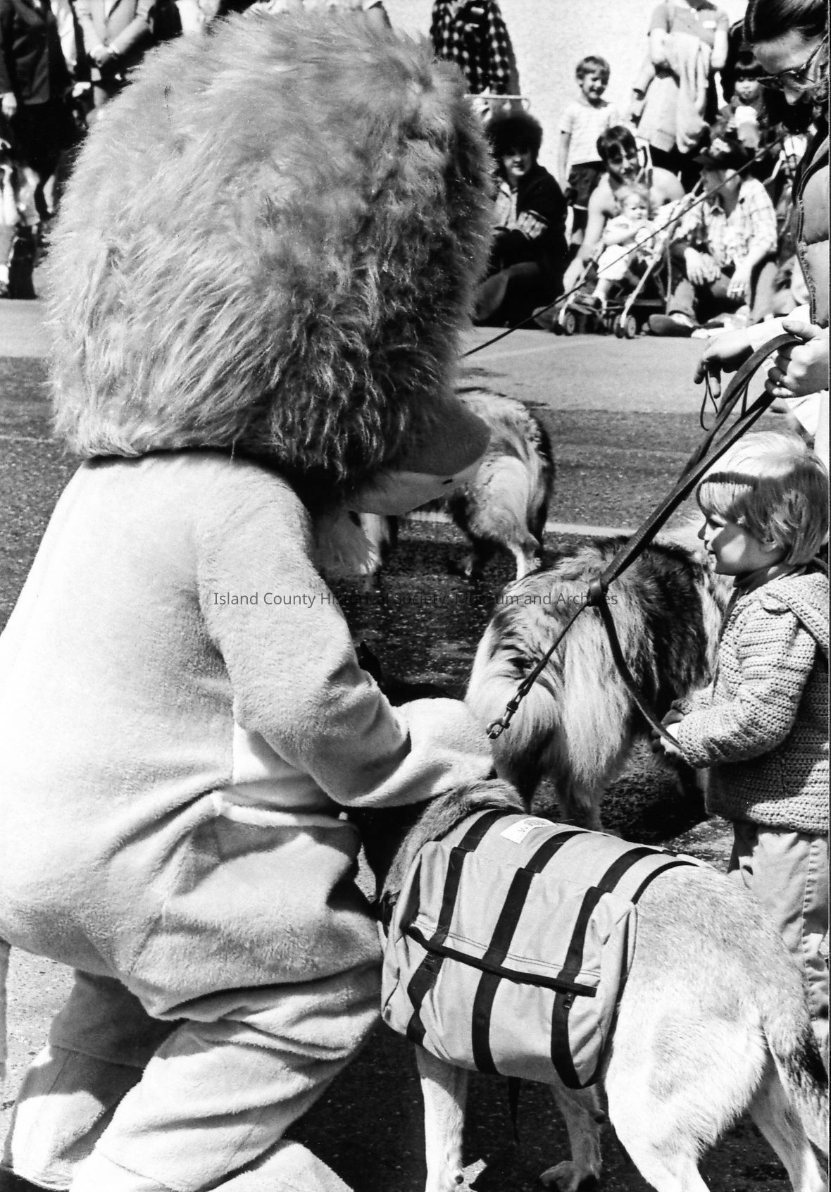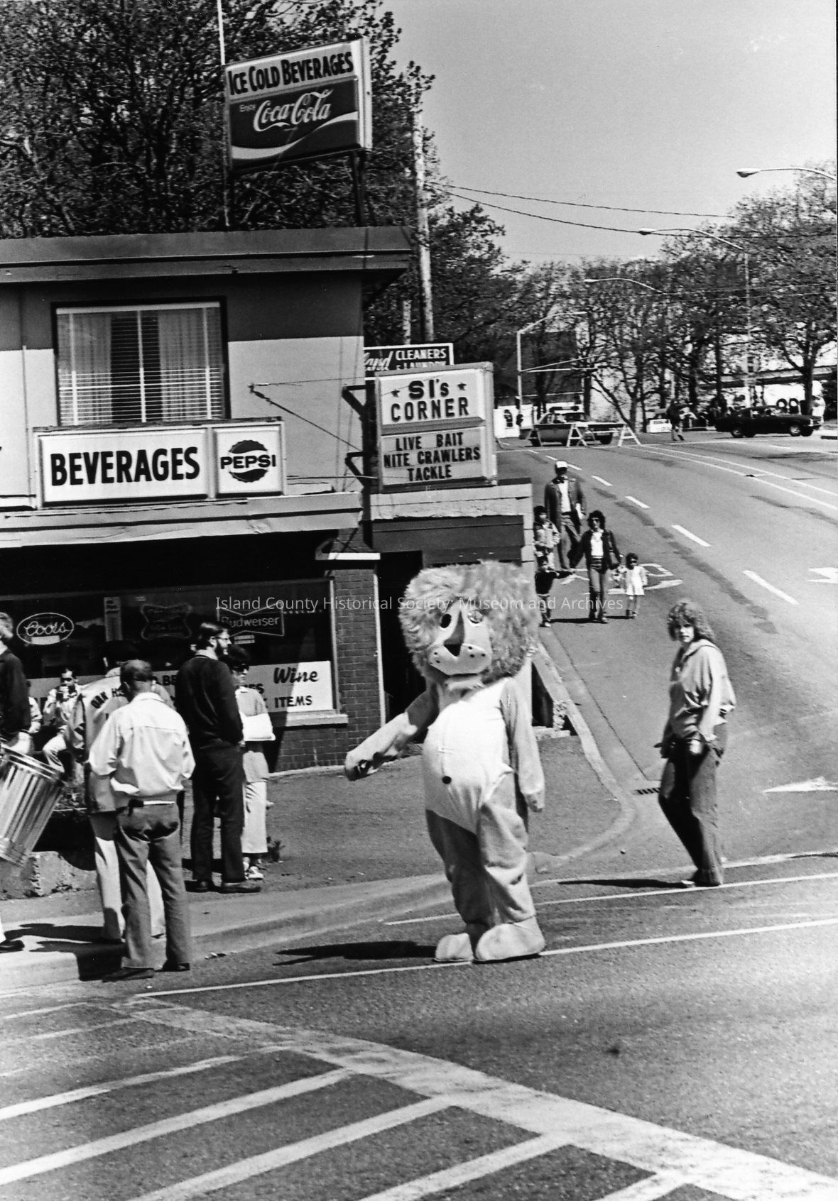 A person in a Lion suit stands on Pioneer Way and Midway in front of Si's Corner in an Oak Harbor Holland Happening parade. A few spectators are visible. The Lion also visits dogs and hugs children.Photograph Details