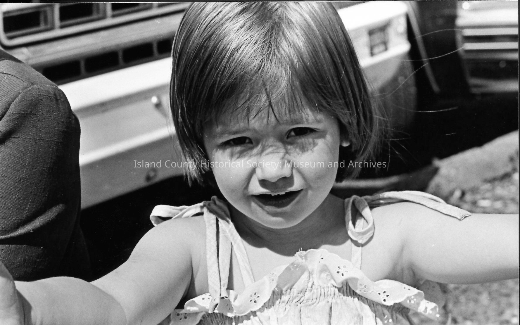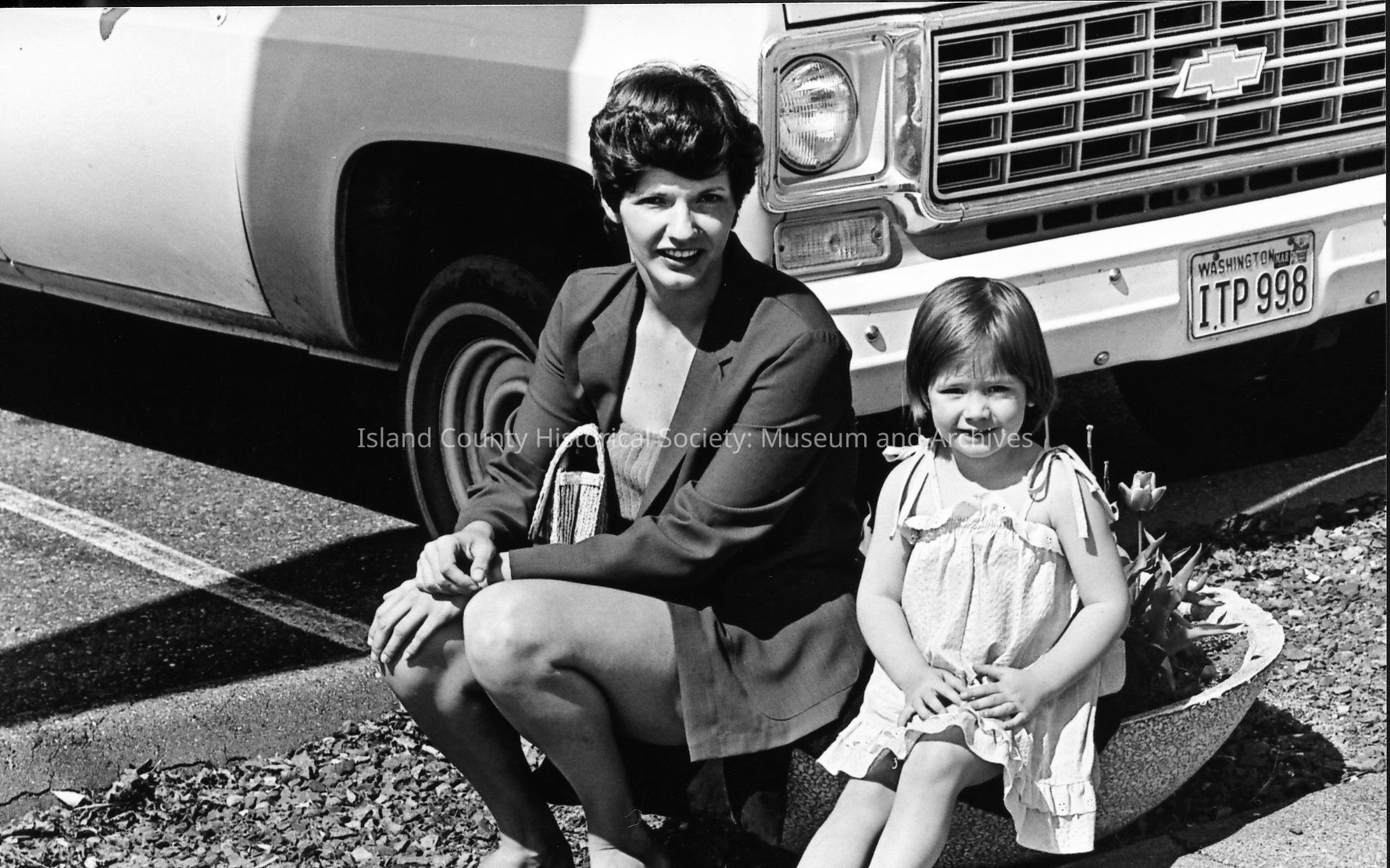 A woman and a young girl sit on the edge of a concrete tulip planter on Pioneer Way to watch an Oak Harbor Holland Happening parade. A Chevrolet pickup truck is parked behind them.Photograph Details