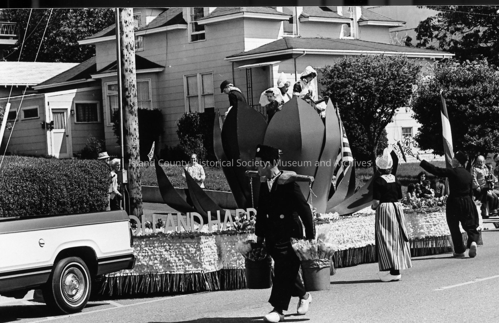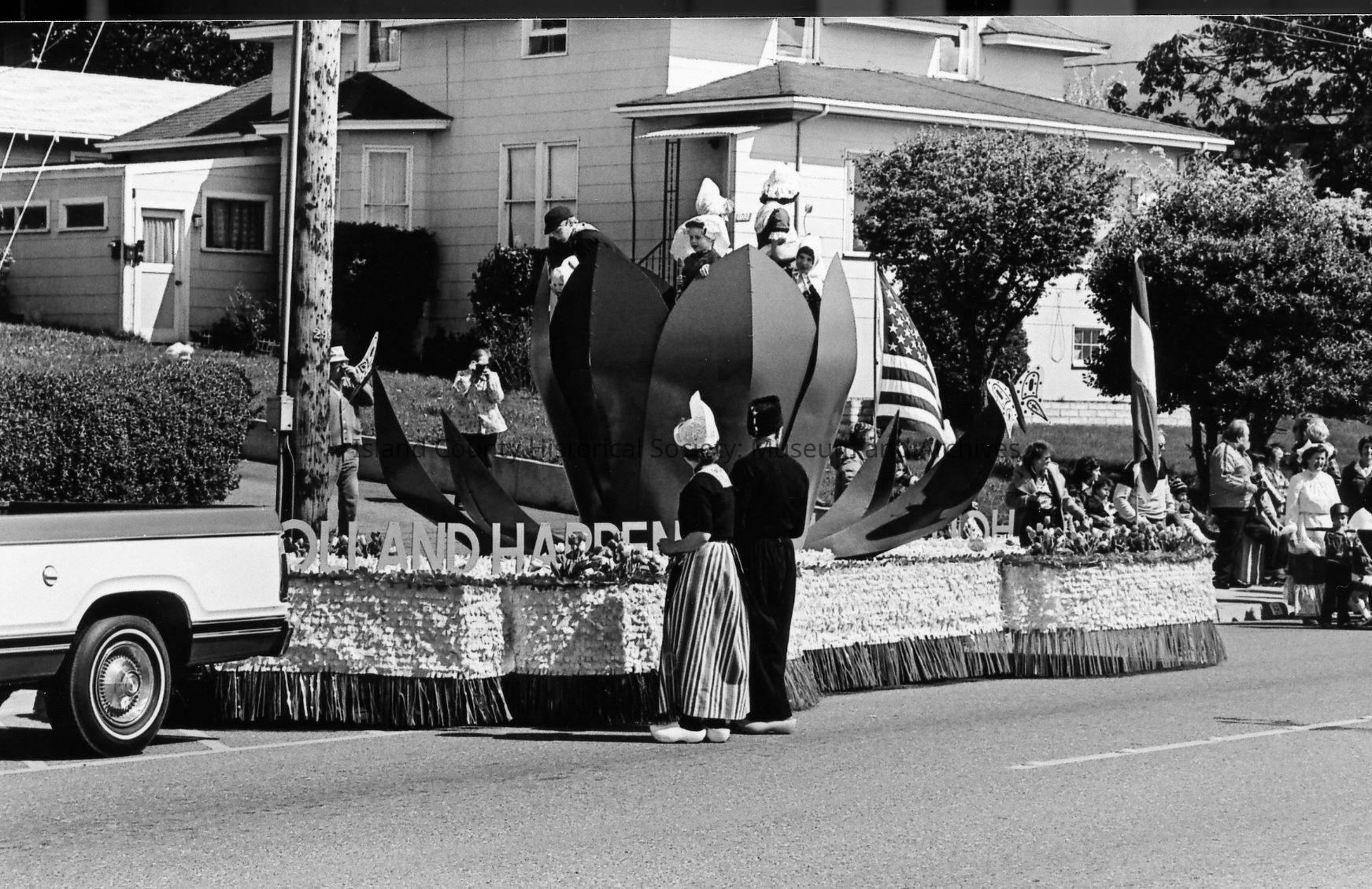 A man in Dutch costume, including wooden shoes, walks past a float on Pioneer Way in an Oak Harbor Holland Happening parade. He wears a shoulder yoke with two buckets filled with tulips and daffodils. A couple in Dutch costume stands near the float with a large tulip bearing children in costume. US and Dutch flags decorate the back. Spectators line the curb.Photograph Details