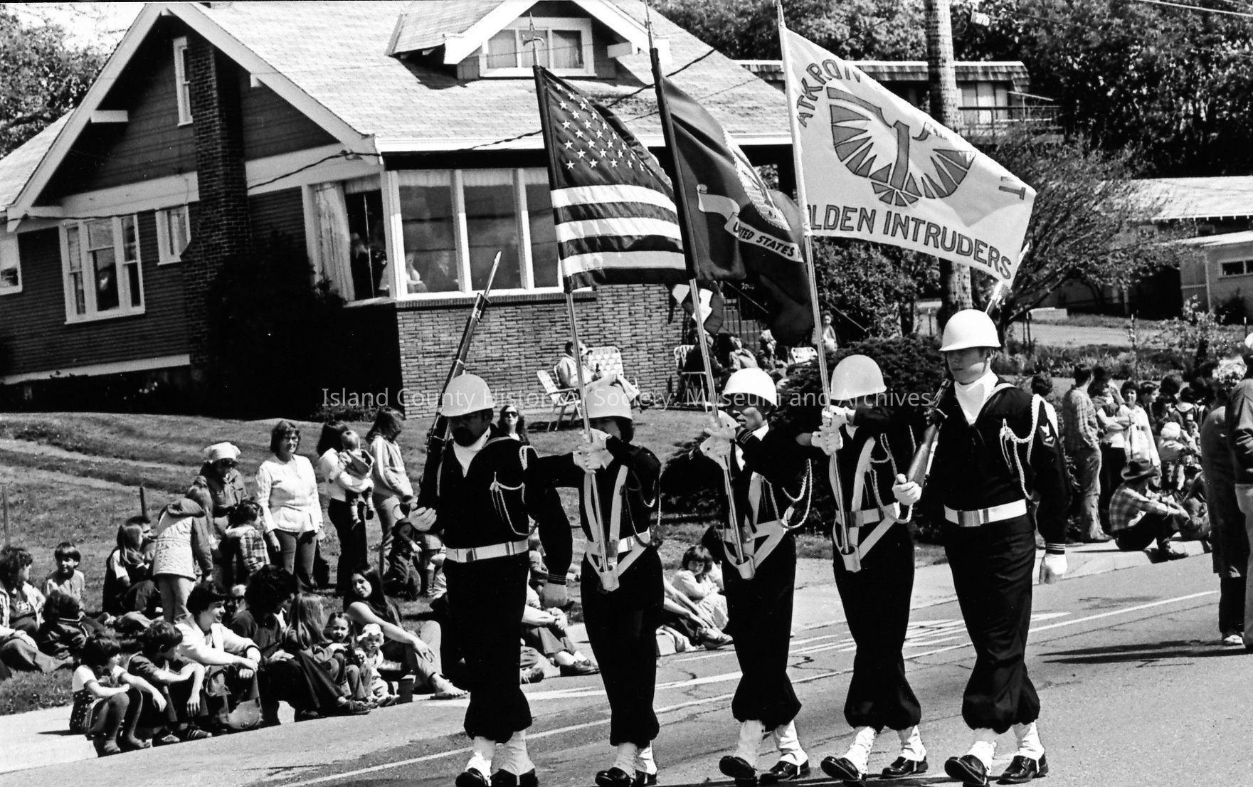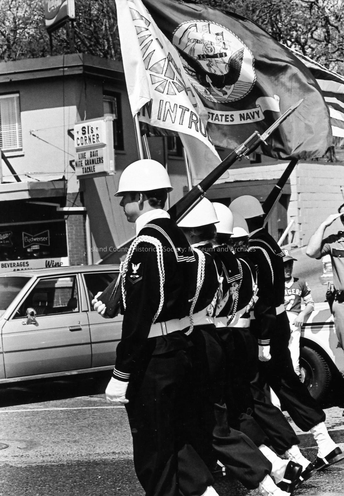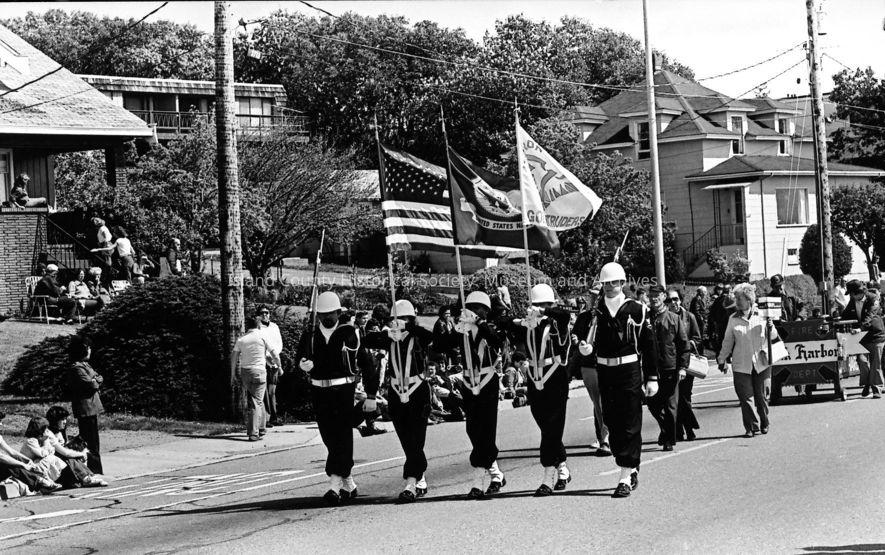 A color guard marches on Pioneer Way to lead an Oak Harbor Holland Happening parade. They carry a United States flag, a U.S. Navy flag, and a Golden Intruders flag, accompanied by guards carrying bayonets. Onlookers line the sidewalk and curb, and as well as the lawn and porch of a nearby house.Photograph Details
