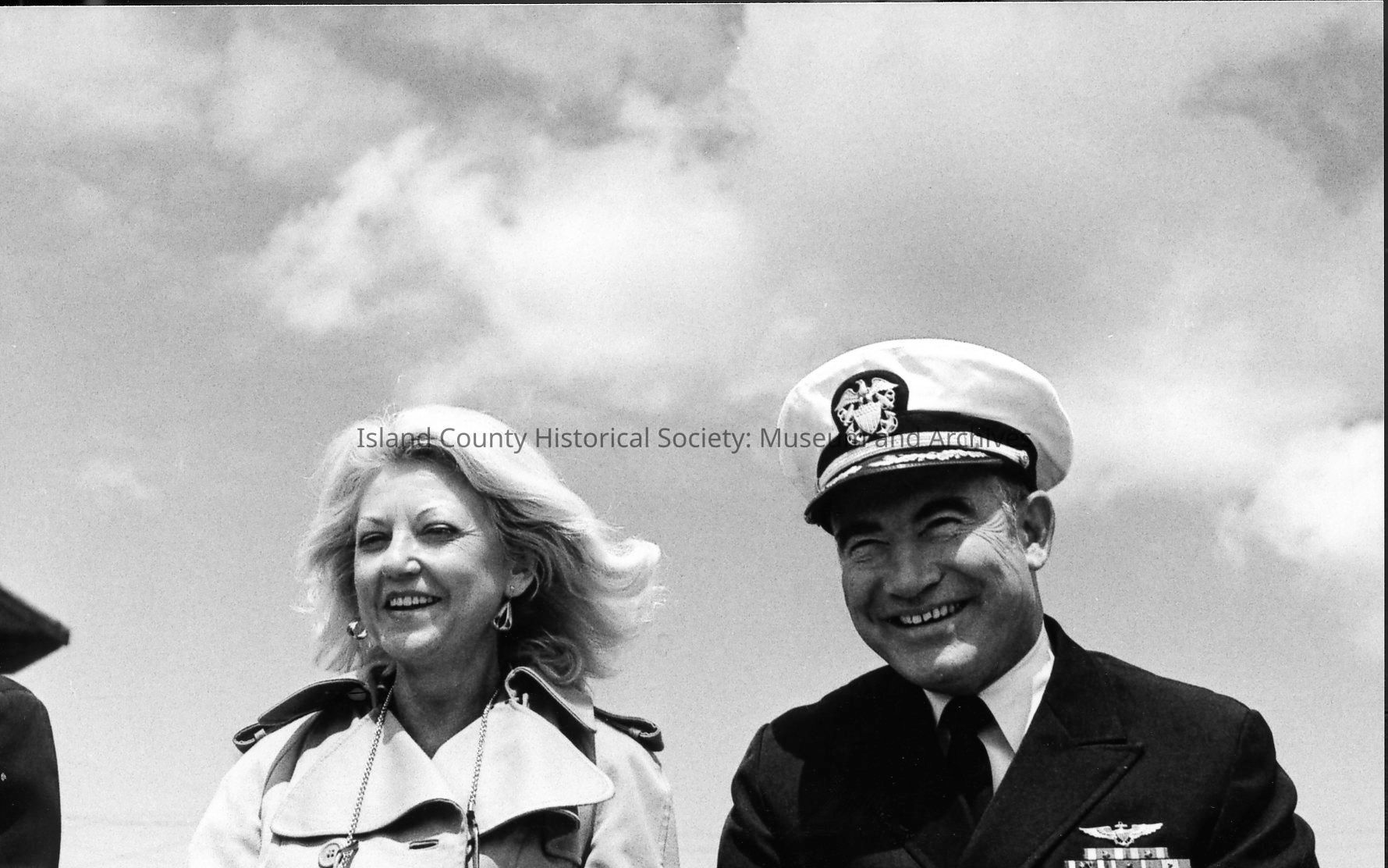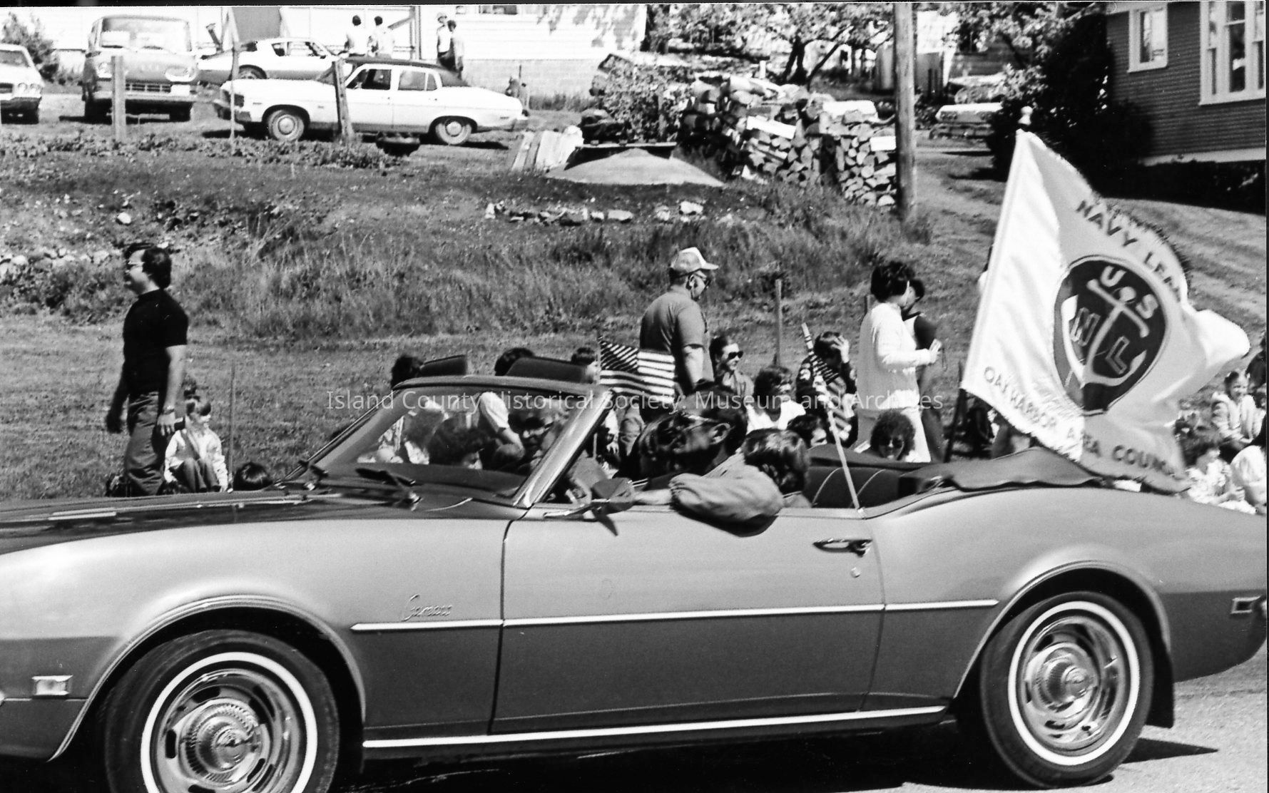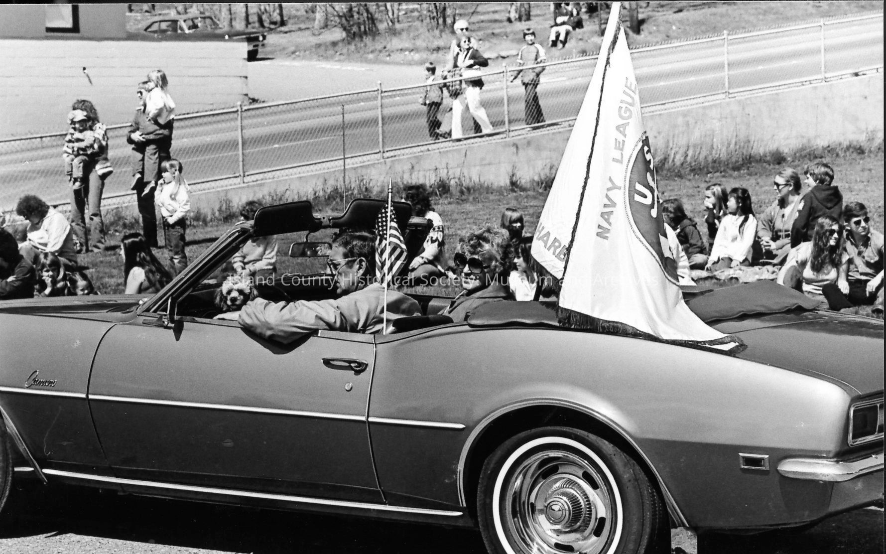 A Navy officer and wife ride on an open convertible in an Oak Harbor Holland Happening parade. She holds a bouquet of tulips. Behind them are a marching band and a float bearing a large tulip filled with costumed children. A Navy League flag flies from a convertible.Photograph Details