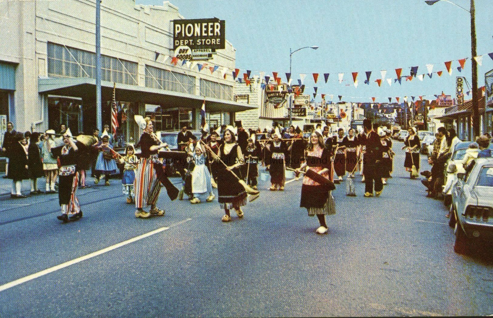 Postcard depicting a Holland Happening parade in Oak Harbor, c. 1970s. Text print on reverse of postcard reads, "Holland Happening in Oak Harbor, Wash. An Annual Festival in the Spring -- While the Tulips are in Bloom."Collection