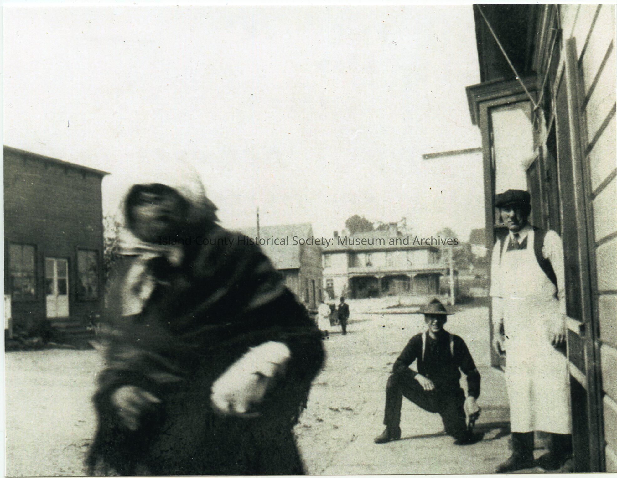 Photo of a building that had been at 24 NW Front Street. A person is walking (blurred) past two men in front of the meat market. On the back: Coupeville, WA. Fall 1906 or Spring 1907. Fred Mayer in apron; Howard Libbey - kneeling. In front of their meat mkt. (market).