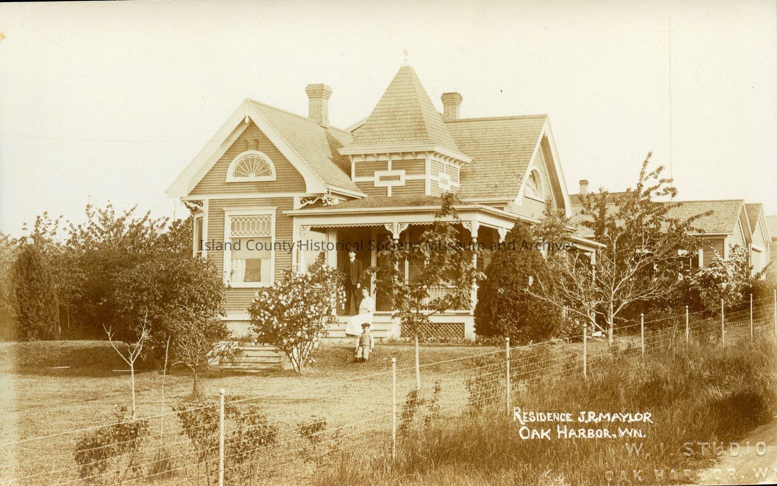 Postcard depicting the J.R. Maylor house in Oak Harbor. Handwritten note on reverse of postcard (note dated 2006) reads, "Joseph & Hattie Maylor Residence. Joe Hattie & Howard. Later owned and occupied by Paul & Wilma (Nc Vliestva) Maylor Building still standing (presently owned by Kathleen Jones accounting firm)."Collection