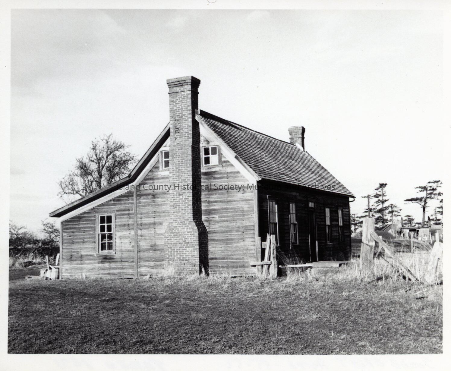This is a black and white photo of the Jacob and Sarah Ebey House which overlooks Ebey's Prairie. The house has two, later three chimneys and originally five dormered windows on the front of the second floor. The house is surrounded by farmland and had views of Ebey's Prairie, Ebey's Landing and the Puget Sound. Caption on the reverse reads: Jacob Ebey's Home Taken 1971Photograph Details