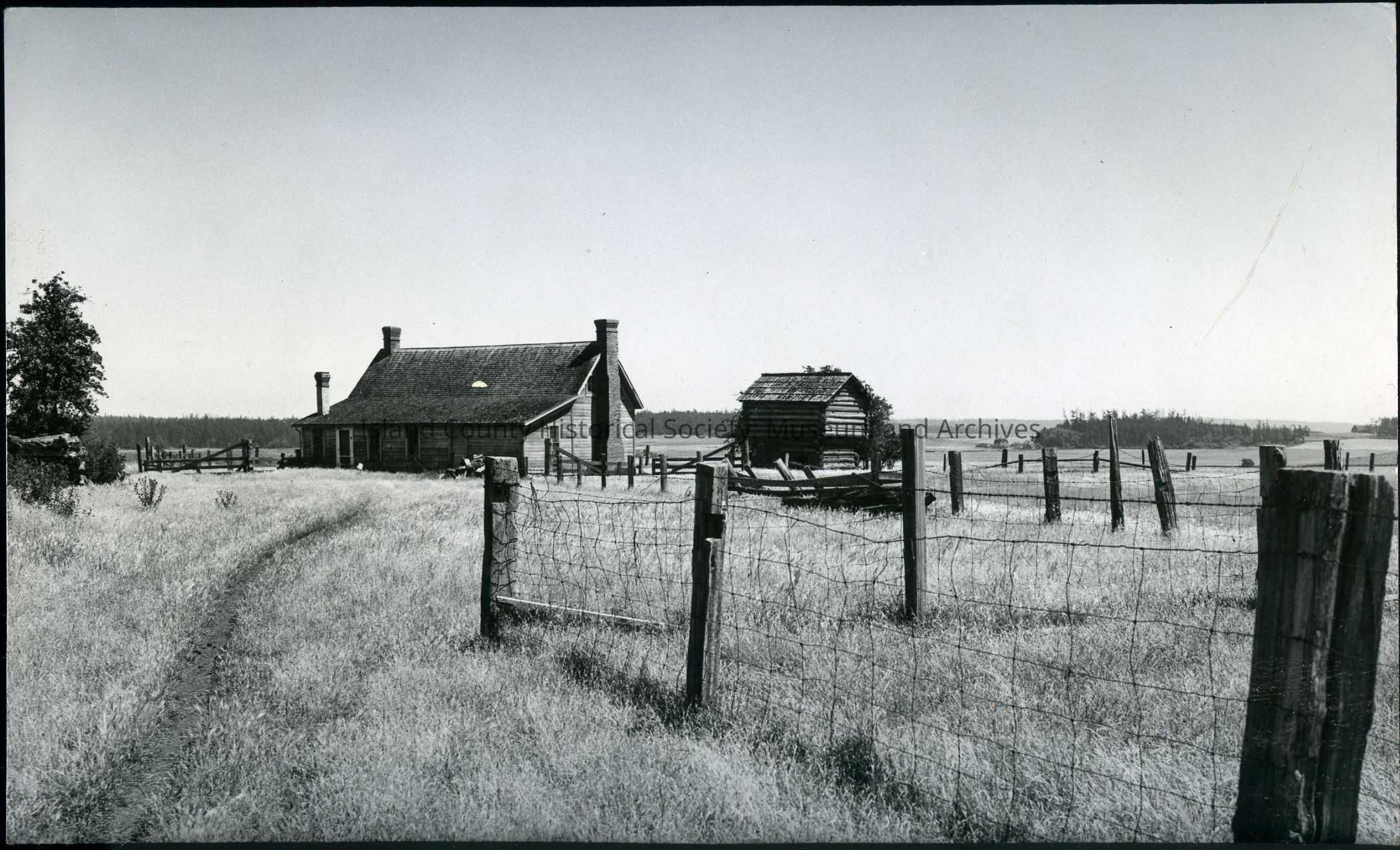 Photograph of Jacob Ebey's home (left), constructed in 1855, and blockhouse (right), constructed in 1856. A typed clipping pasted on the reverse of the photo reads, "On west side of island, overlooking Ebey's Prairie, stands old frame home of Jacob Ebey, father of colonel killed by Indians. This view from rear shows blockhouse built for protection and later used by Winfield Ebey as first law office on Whidby Island. Isaac Ebey was first permanent settler; his father, who fought in War of 1812, came soon after."