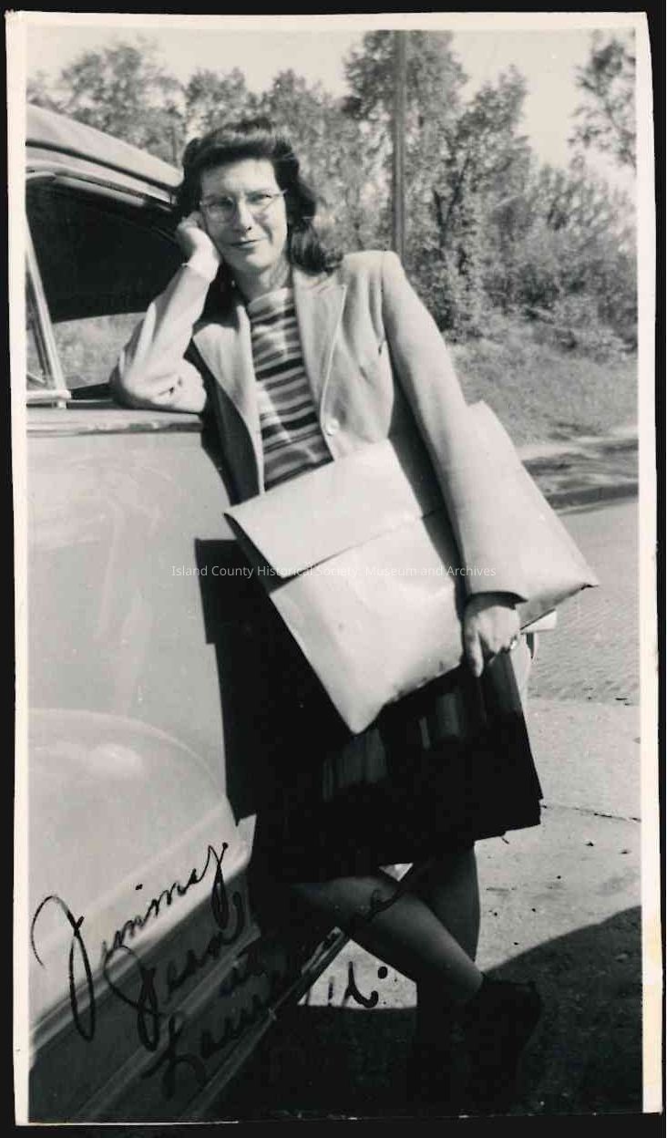 Small black and white photo of Jimmie Jean Cook leaning against a car, holding art portfolio in arm. Pen note on front reads "Jimmy Jean at Lawrence K.S." University of Kansas.Photograph Details