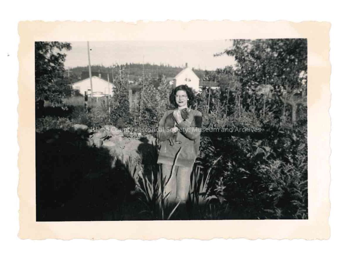 Small scalloped edge black and white photo of Jimmie Jean Cook standing in garden/yard of her sister's house and holding a dark-colored cat, c. 1950. Looking east.