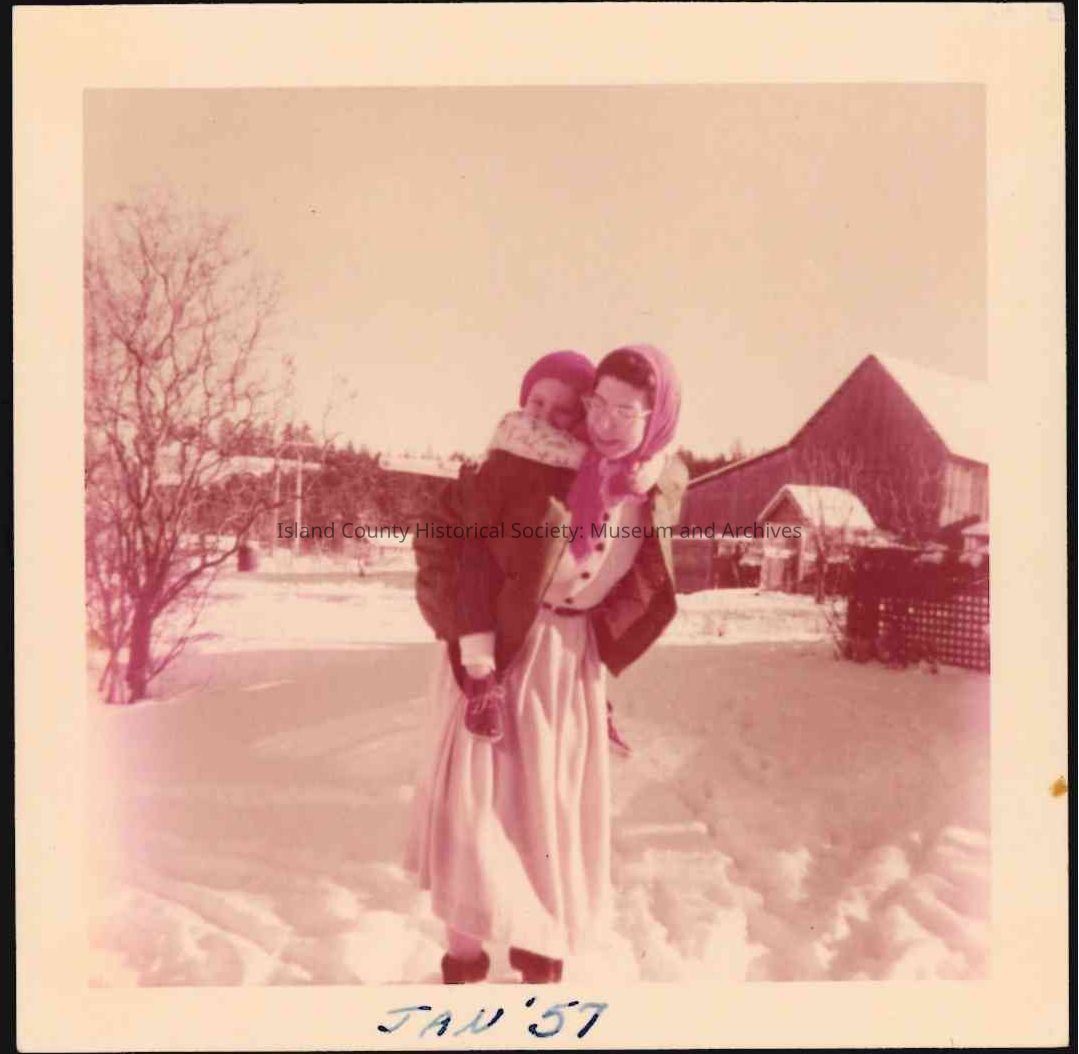 Small faded color photo of Jimmie Jean Cook holding nephew Ken House on her back, in snowy backyard of Zylstra house. C. February 1957.Photograph Details