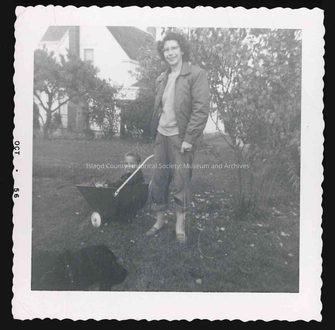 Small, scalloped edge black and white photo of Jimmie Jean Cook and nephew Ken House (in wheelbarrow) standing in garden/yard/orchard of the Zylstra house, c. October 1956.Photograph Details