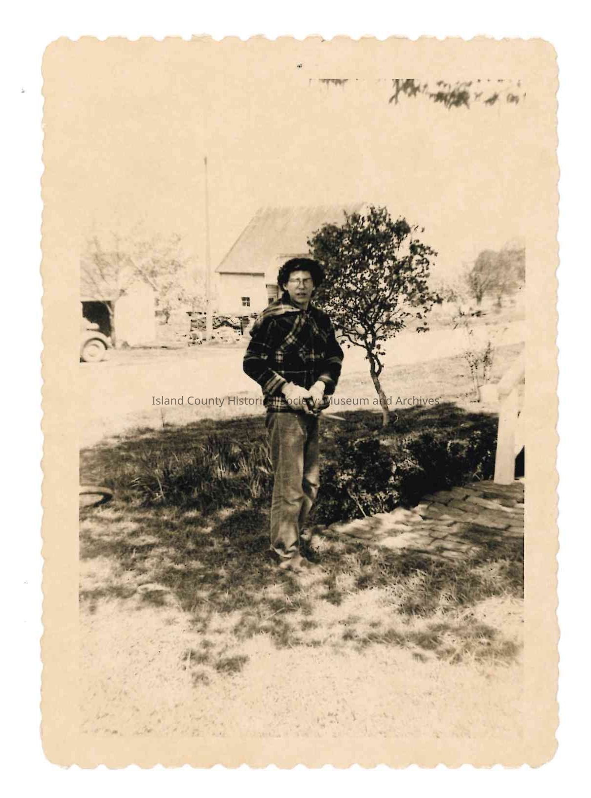 Medium scalloped edge black and white photo of Jimmie Jean Cook standing in garden/yard at her sister's house, holding a pair of gardening shears, looking north, c. 1950Photograph Details
