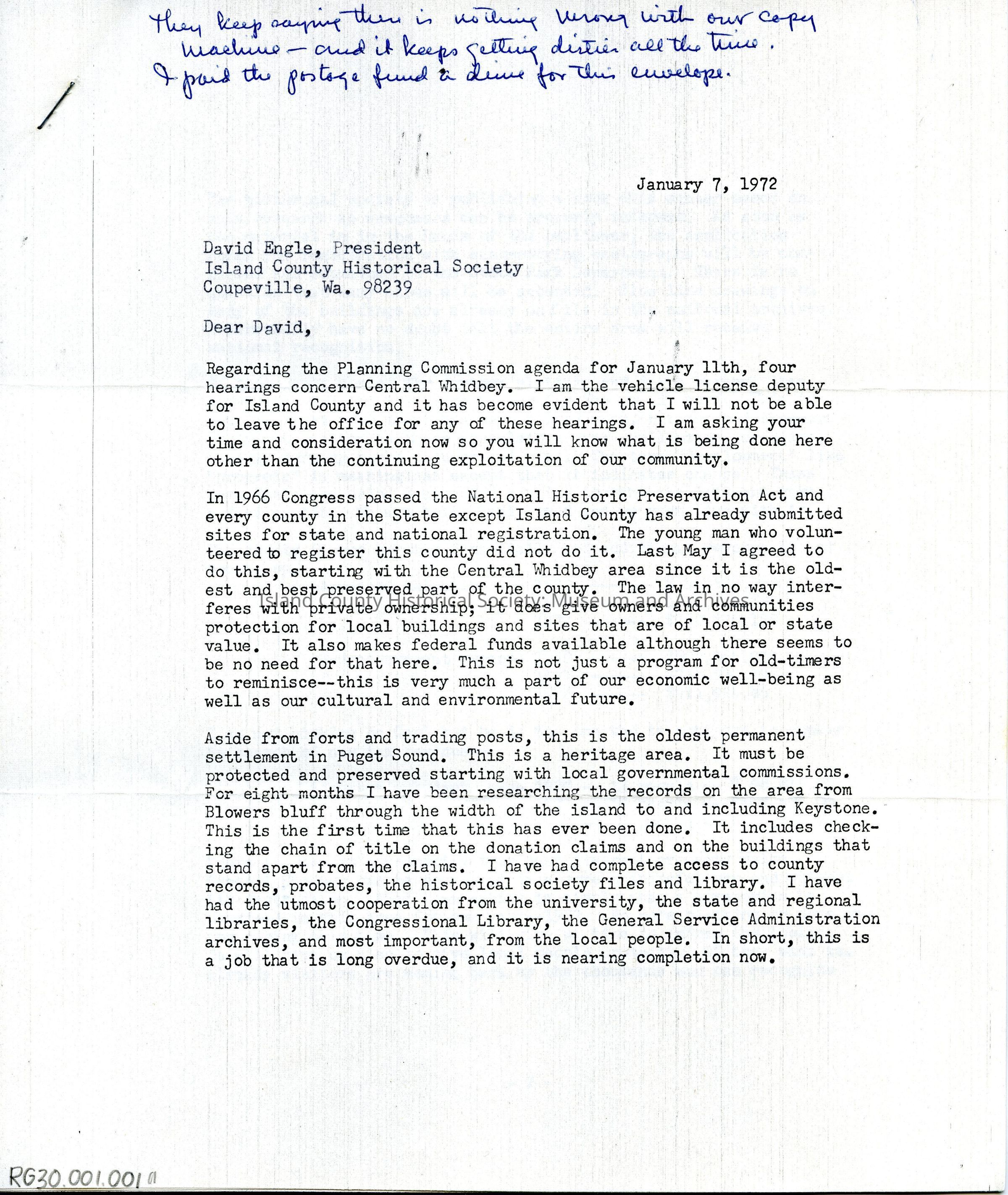 Jimmie Jean Cook letter to David Engle, President of ICHS, concerning the protection of the Central Whidbey Historic District - 3 pages.Lexicon