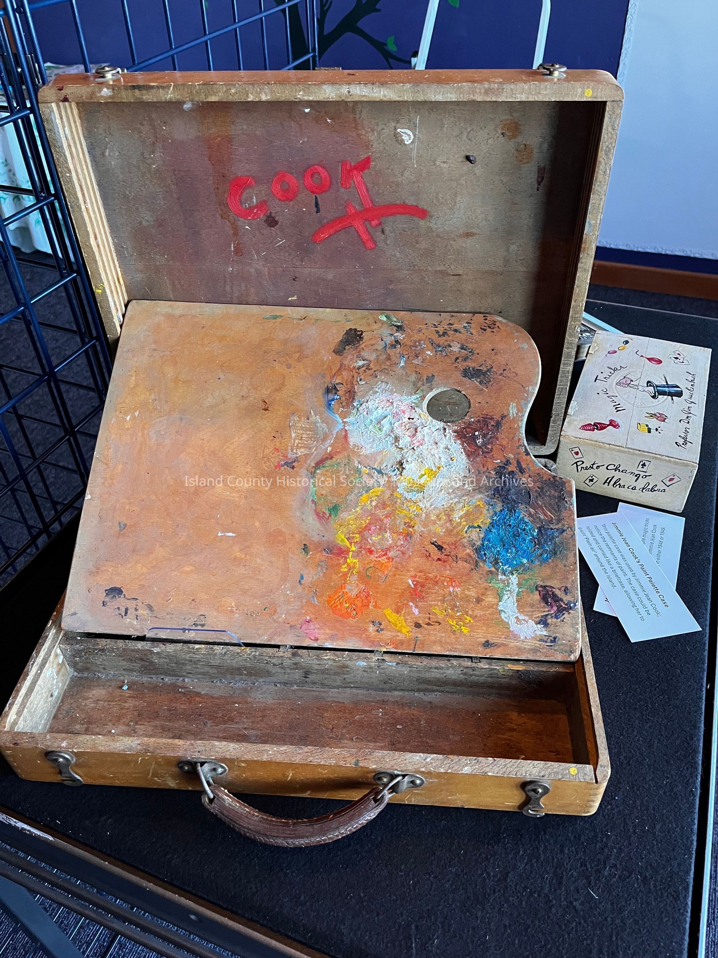 Jimmie Jean Cook's artist's briefcase with removable palette that still has paint on it. This allowsInscription/Signature/Marks