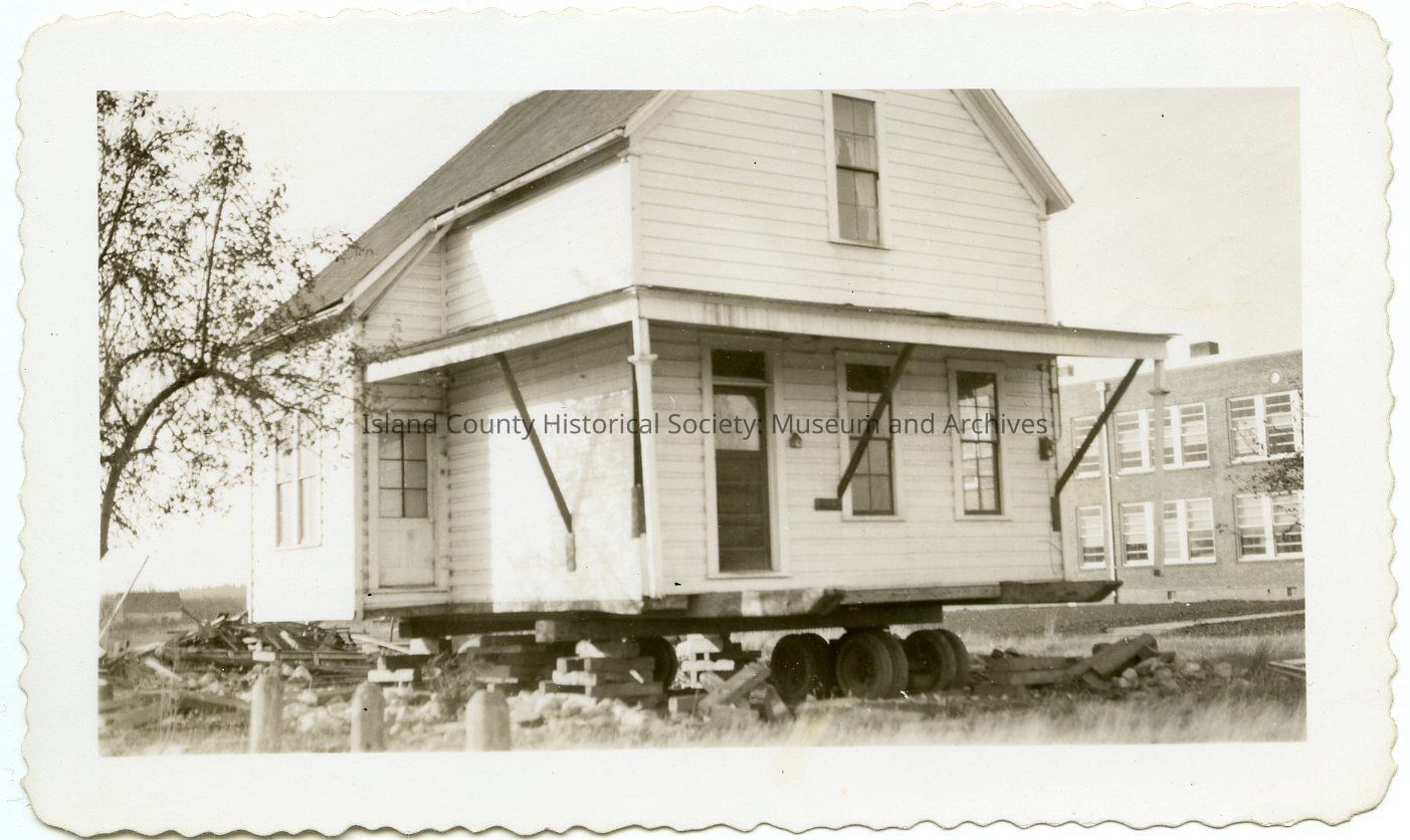 Photo of two-story house (side view) with steep pitched roof and a large bay window. There was an addition on the back - can see the markings on the siding. The house is up on wheels ready to be moved to another location. A tall metal fence is in the background. On the back: House ready to move from the school yard.