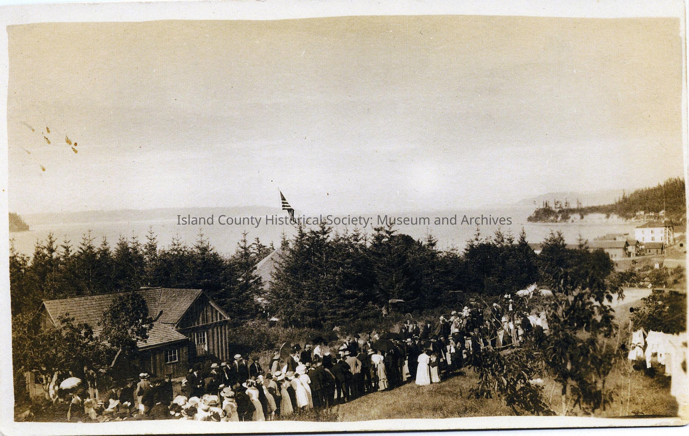 Photo enlarged from a postcard of the town park showing the pavillion. "taken from the upstairs of my home last 4th, and you can see the old bay, pavillion can be seen in the trees" Property of George and Annie Hesselgrave.Made/Created
